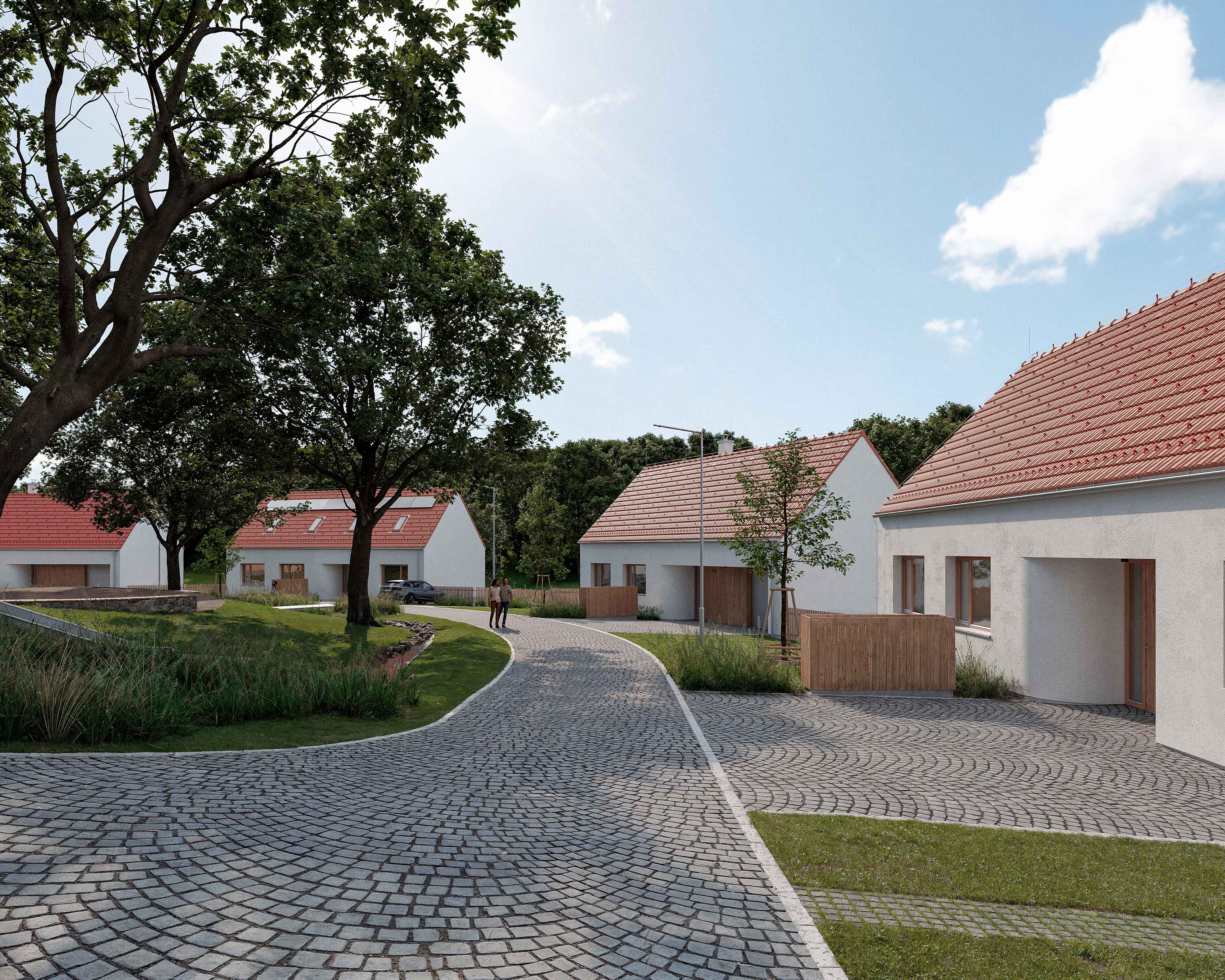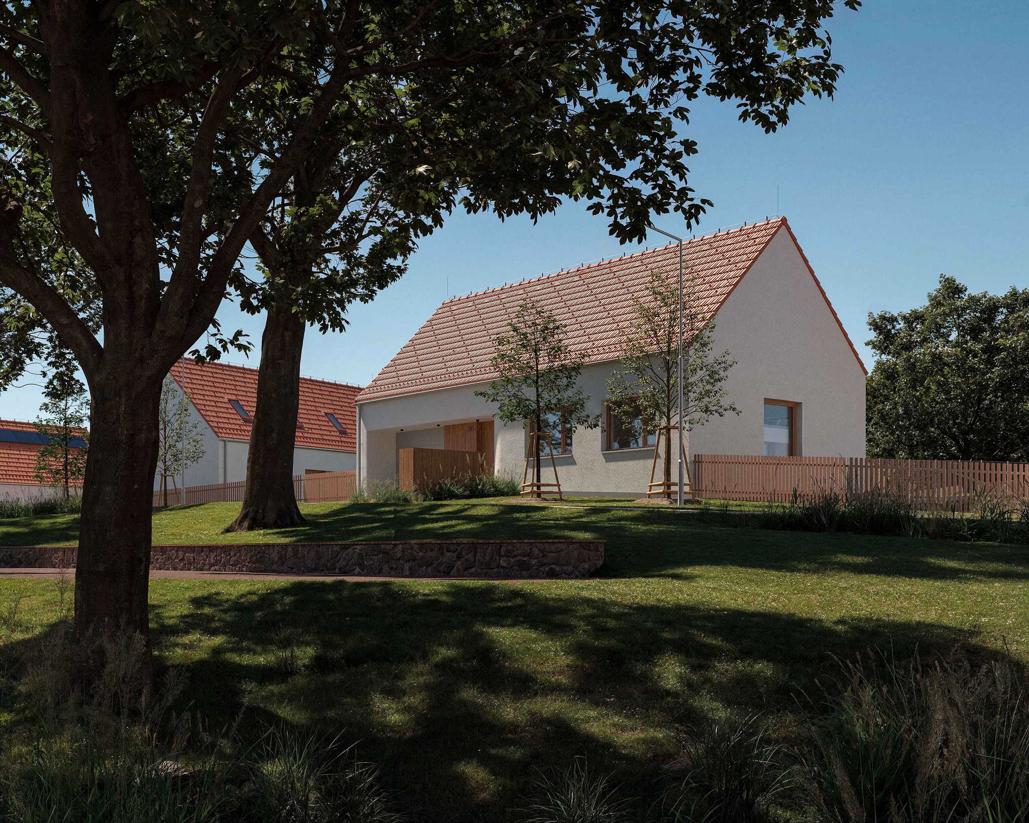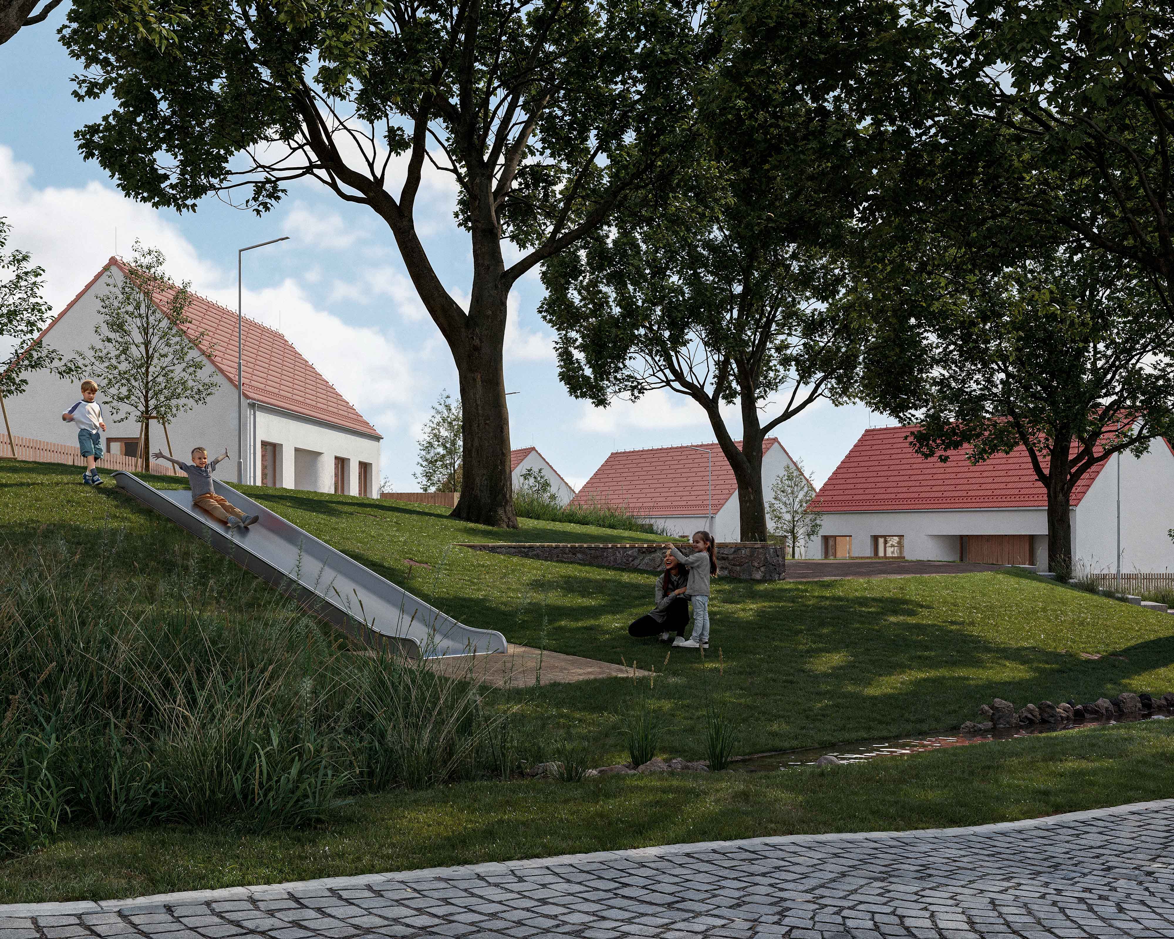 Na okraji obce, v místě, kde se zahrady pomalu rozplývají do luk a cest k lesu, jsme spolu s obcí hledali podobu nového sousedství. Obec chtěla využít svůj pozemek tak, aby přirozeně navázal na vesnici a umožnil její citlivý rozvoj. Cílem bylo vytvořit čtvrť, která se nestaví proti krajině, ale z ní přirozeně vyrůstá. Místo, kde může vesnice dál růst, aniž by ztratila svůj klid a měřítko.