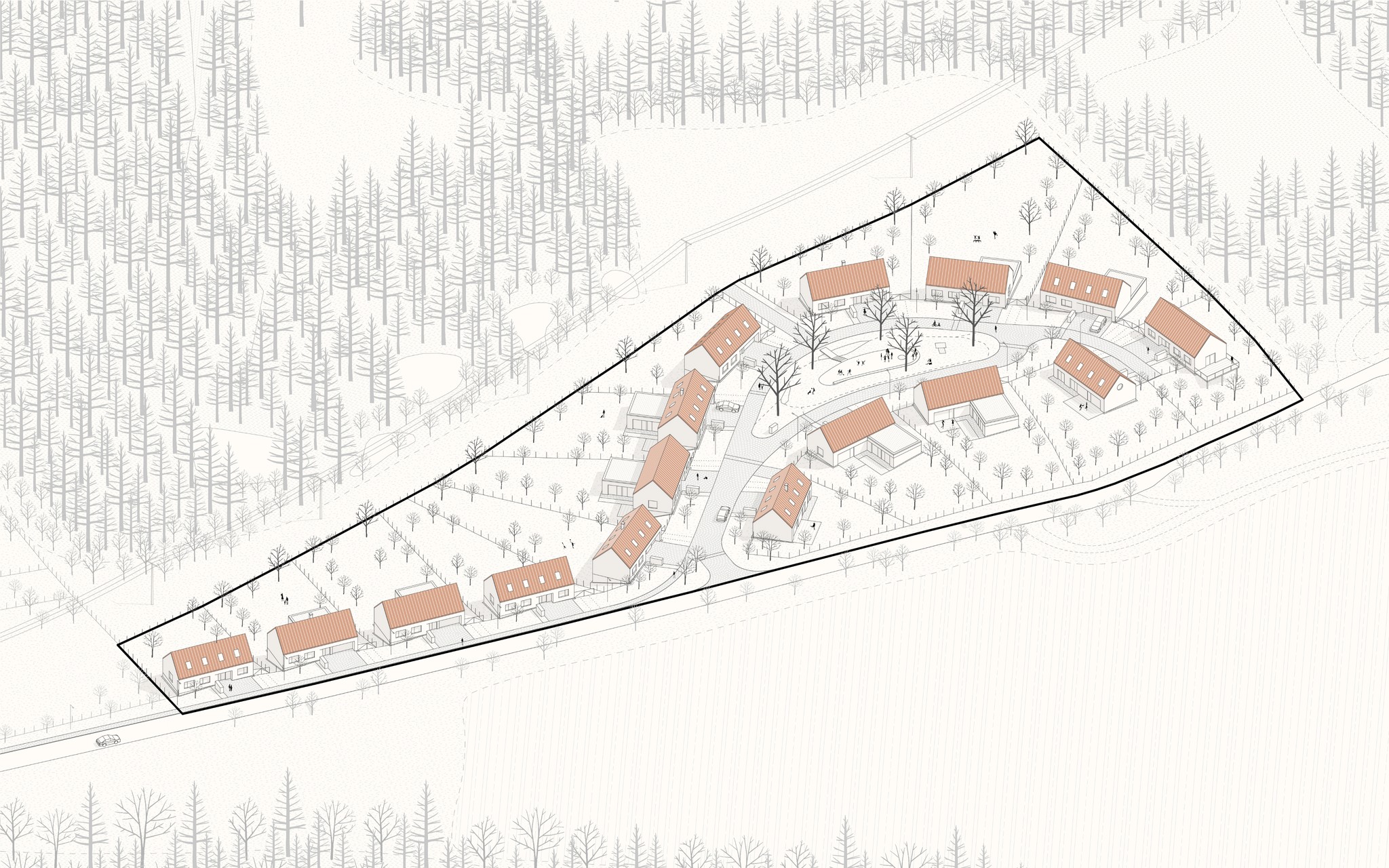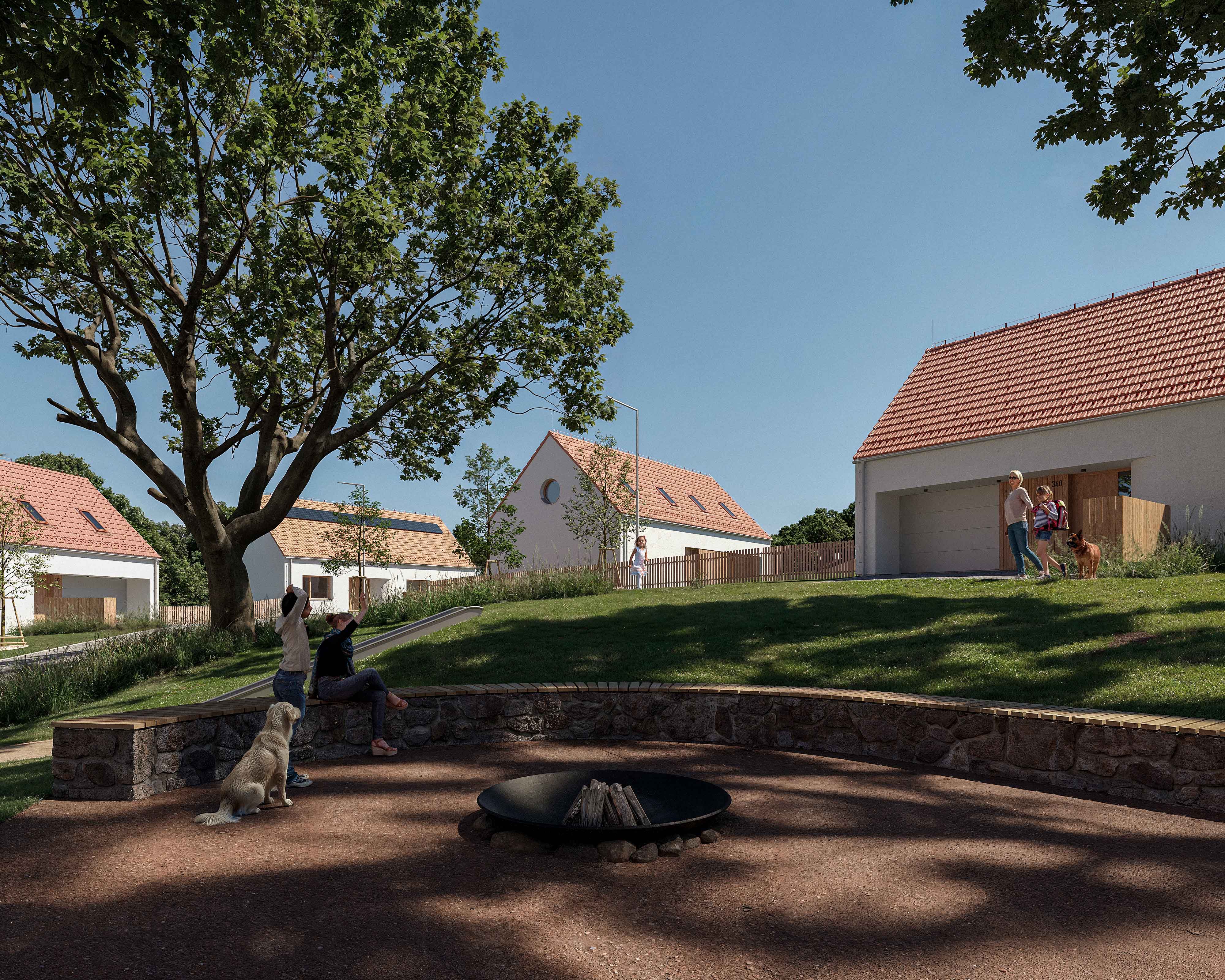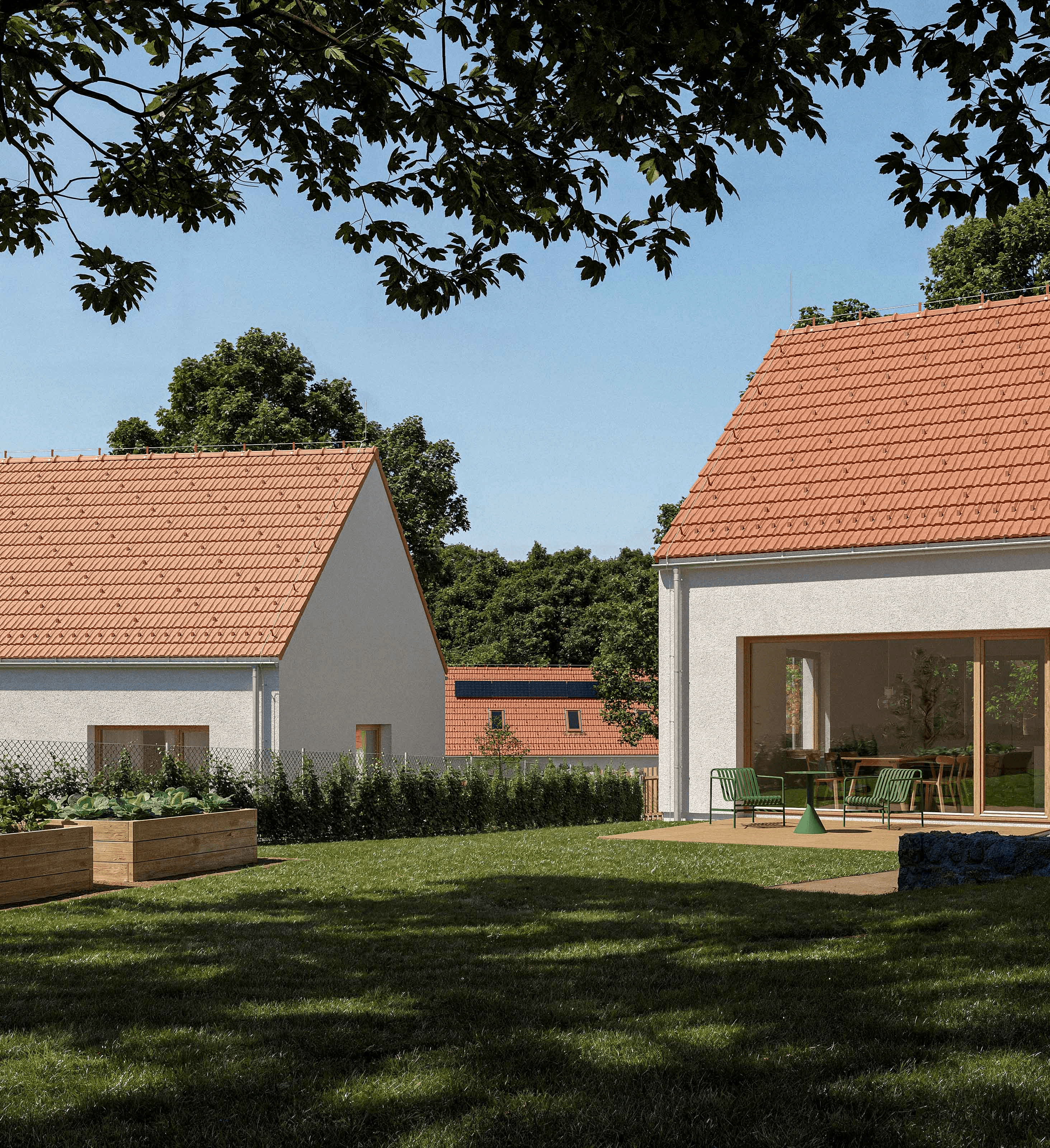 Na okraji obce, v místě, kde se zahrady pomalu rozplývají do luk a cest k lesu, jsme spolu s obcí hledali podobu nového sousedství. Obec chtěla využít svůj pozemek tak, aby přirozeně navázal na vesnici a umožnil její citlivý rozvoj. Cílem bylo vytvořit čtvrť, která se nestaví proti krajině, ale z ní přirozeně vyrůstá. Místo, kde může vesnice dál růst, aniž by ztratila svůj klid a měřítko.