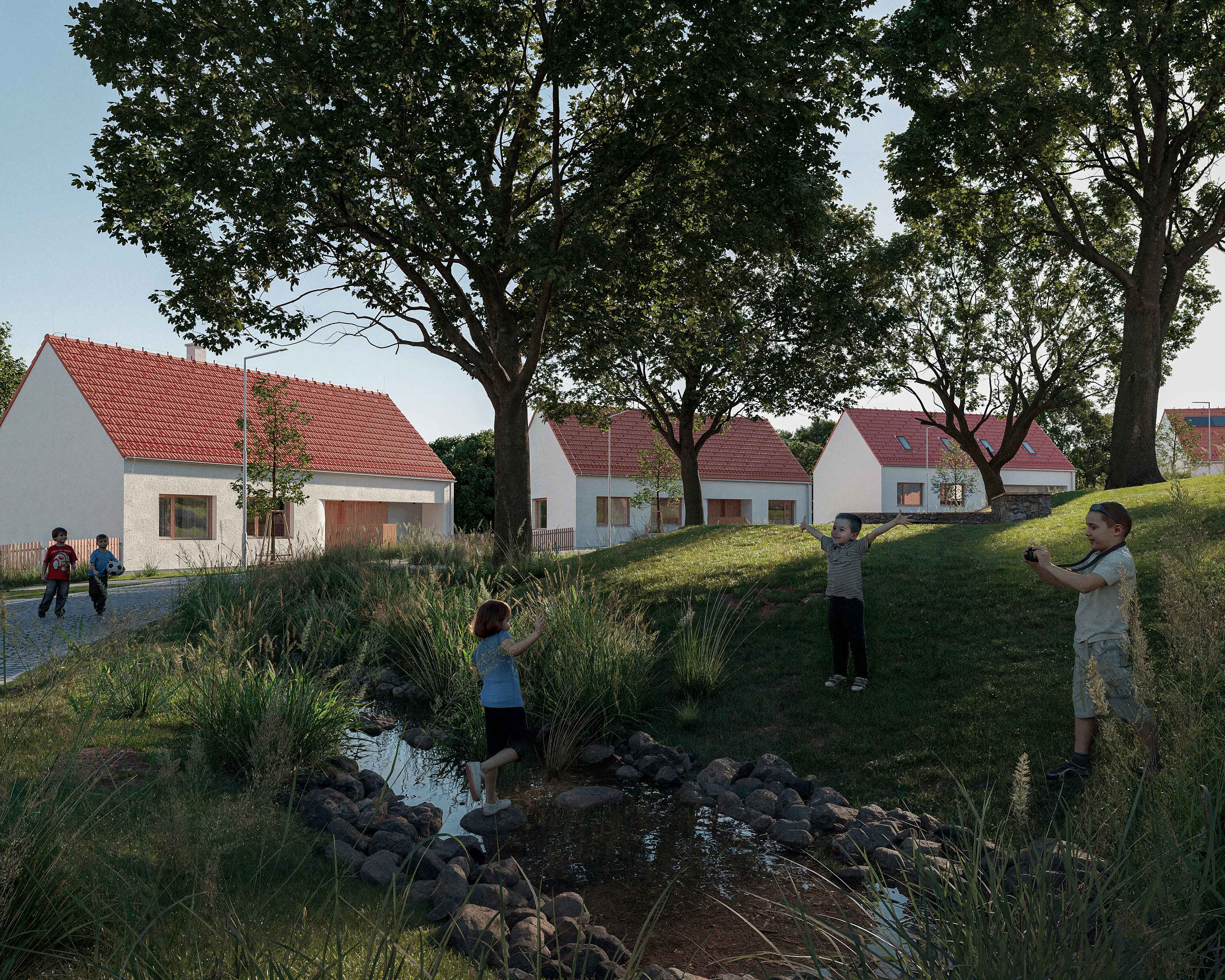 Síla návrhu je v prostoru mezi domy. Ulice se stávají místy pro setkávání, pro hru, pro krátké zastavení. Každé místo má svůj rytmus, někde panuje ticho, jinde život. Domy vytvářejí přirozené hranice, ne bariéry. Materiály jsou střídmé a důvěrné, dřevo, kámen, zeleň. Všechno působí samozřejmě, jako by tu to místo bylo odjakživa.