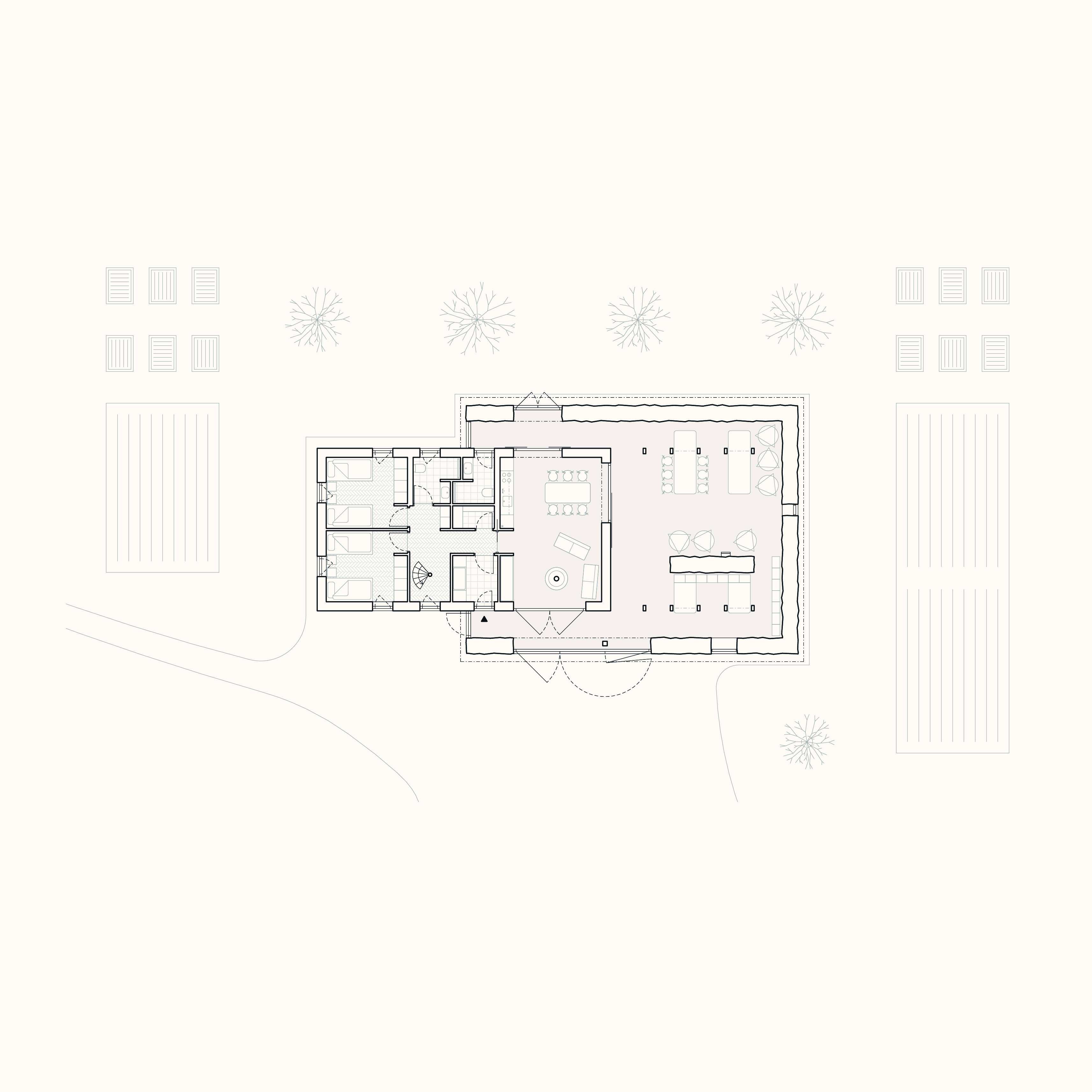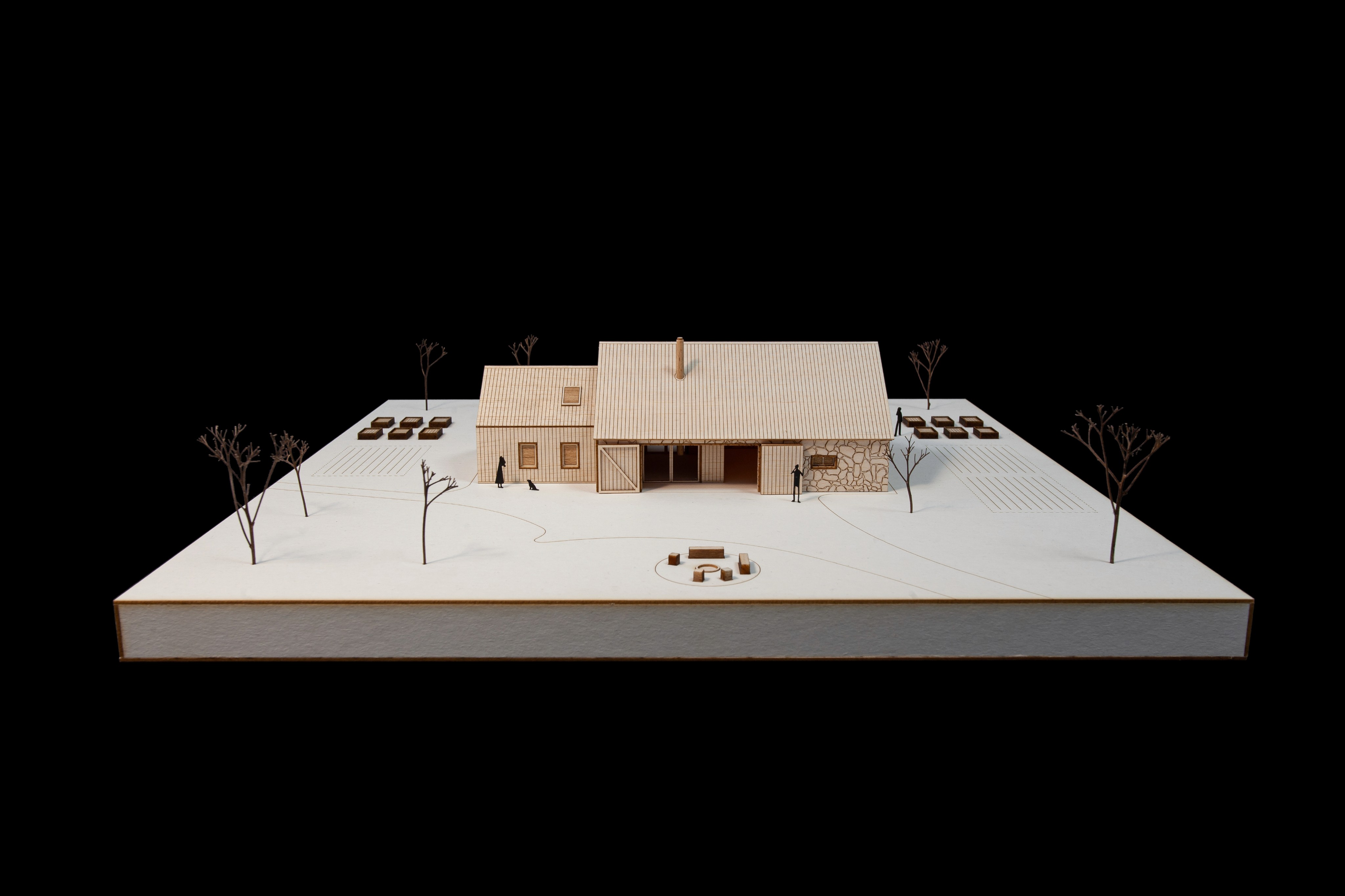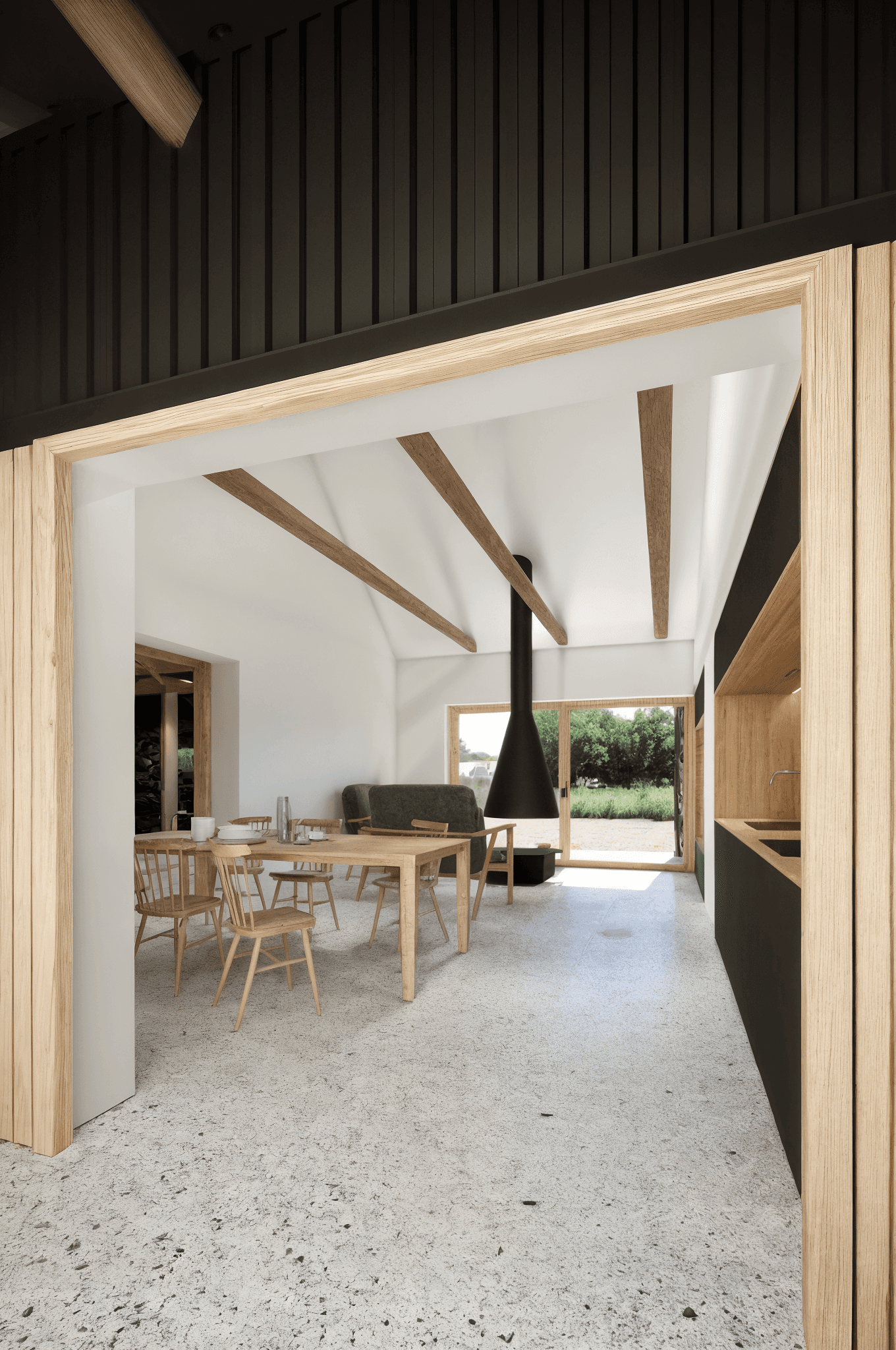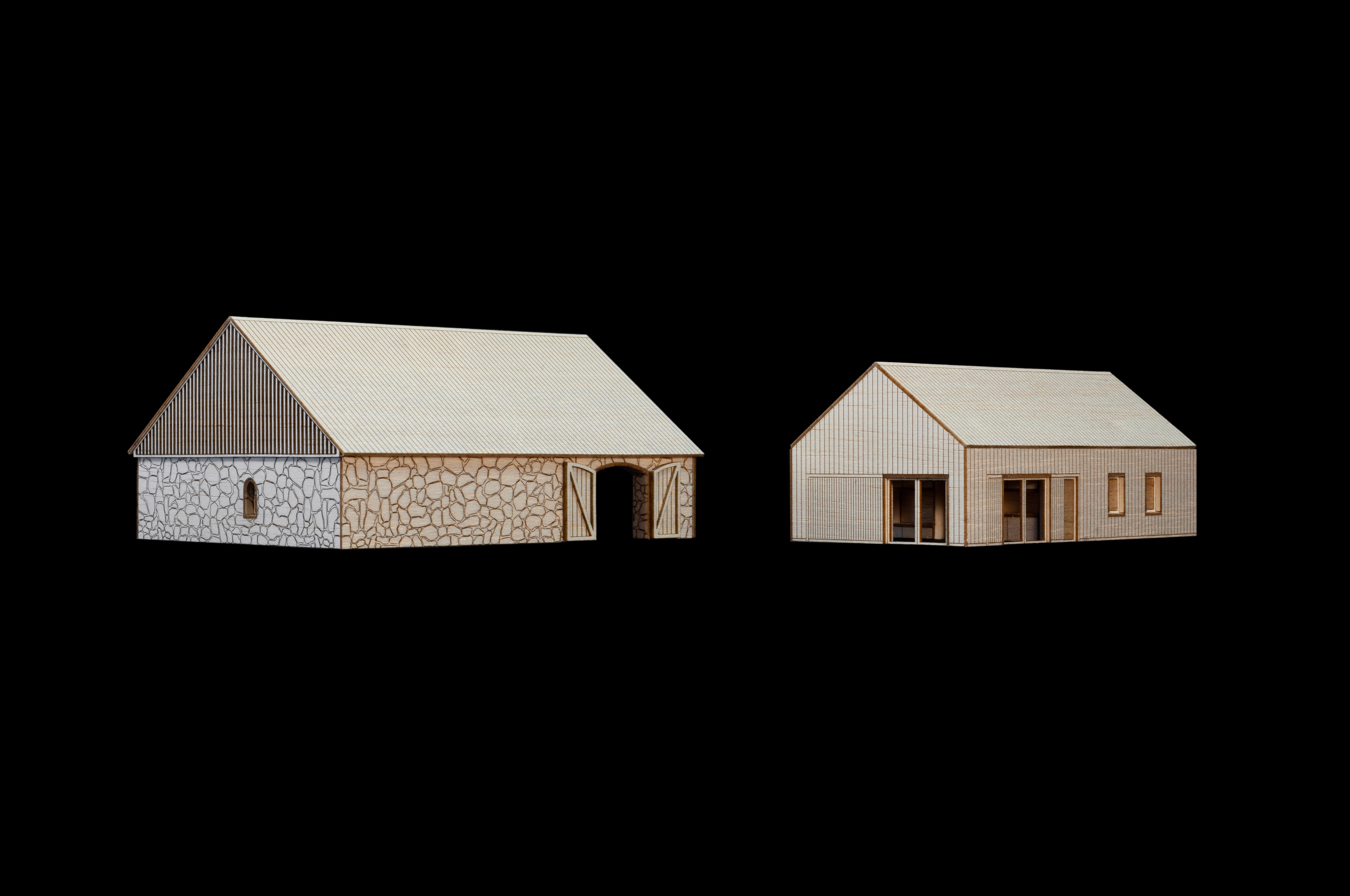 Vložená hmota nabízí ubytování pro hosty, společný obývací prostor s krbem i potřebné zázemí. Odtud se vstupuje přímo do otevřeného prostoru stodoly, vše je blízko a propojené. Obývá se tu dům i stodola zároveň, podle denního rytmu lidí, práce a světla.