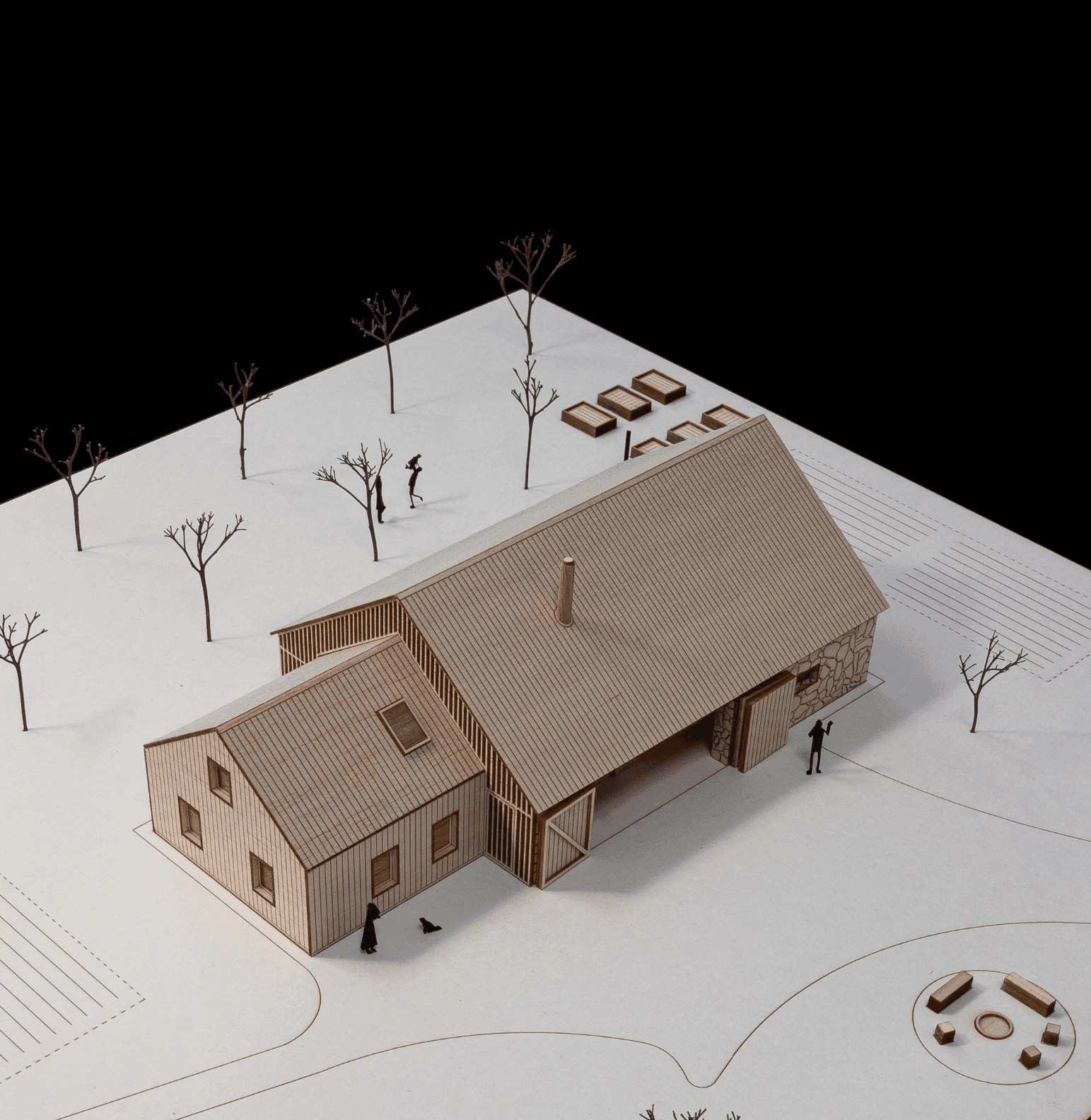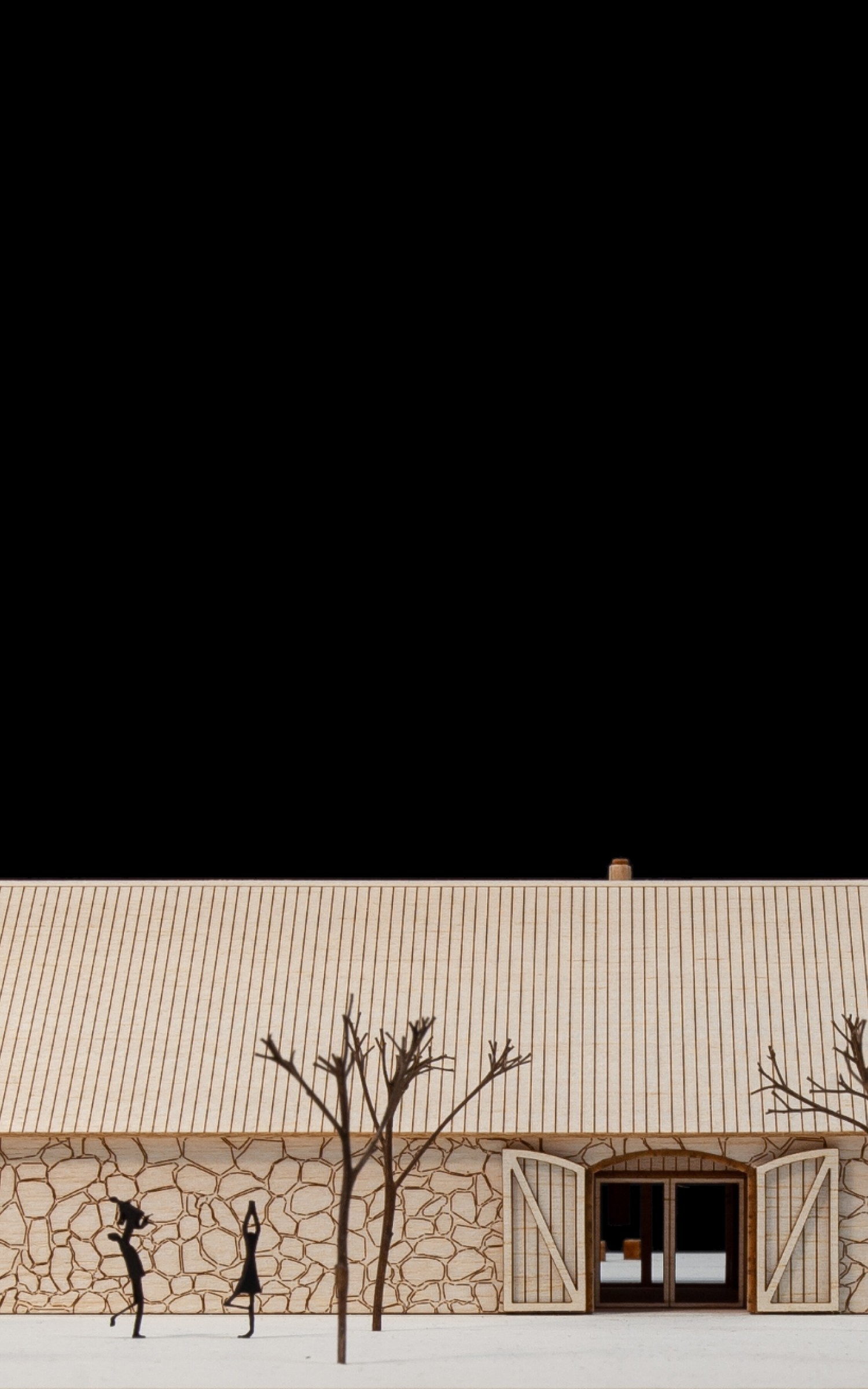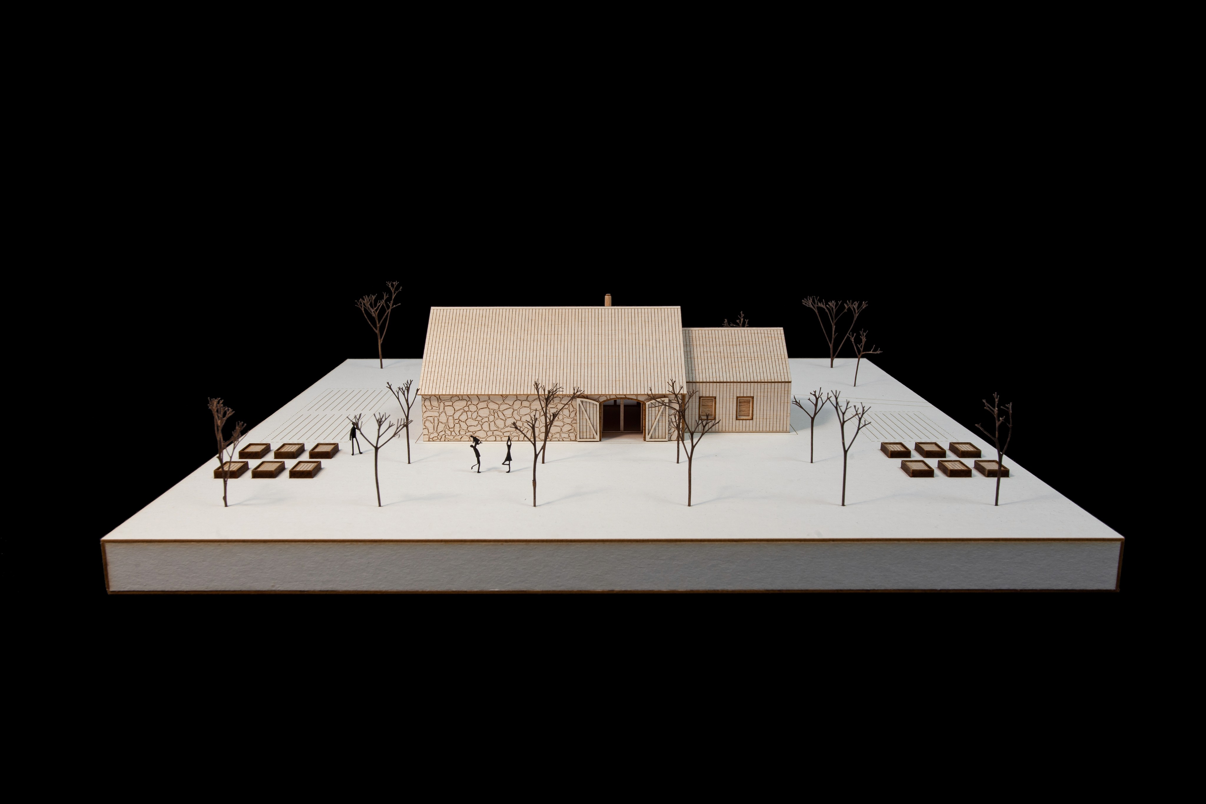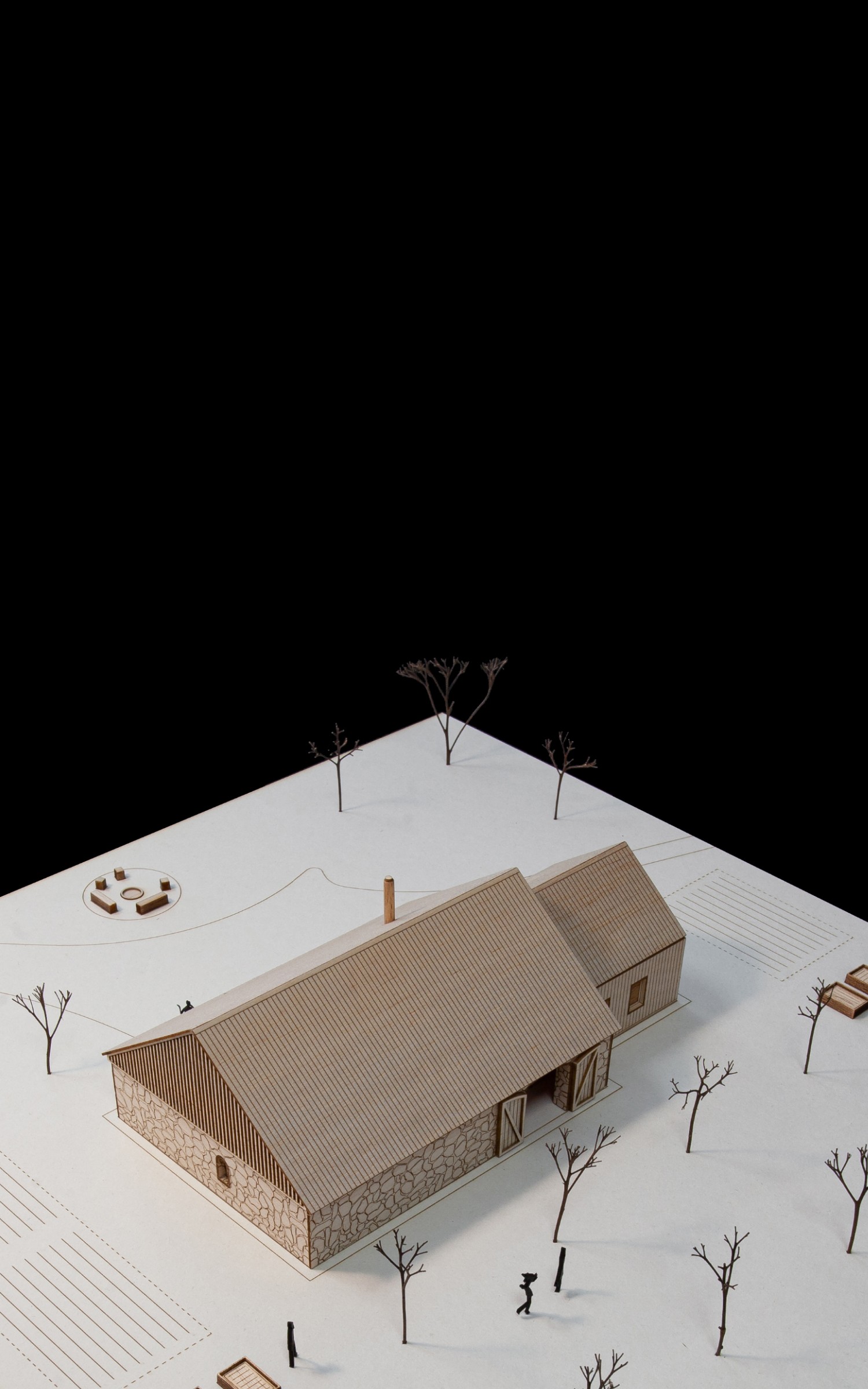 Vložená hmota nabízí ubytování pro hosty, společný obývací prostor s krbem i potřebné zázemí. Odtud se vstupuje přímo do otevřeného prostoru stodoly, vše je blízko a propojené. Obývá se tu dům i stodola zároveň, podle denního rytmu lidí, práce a světla.