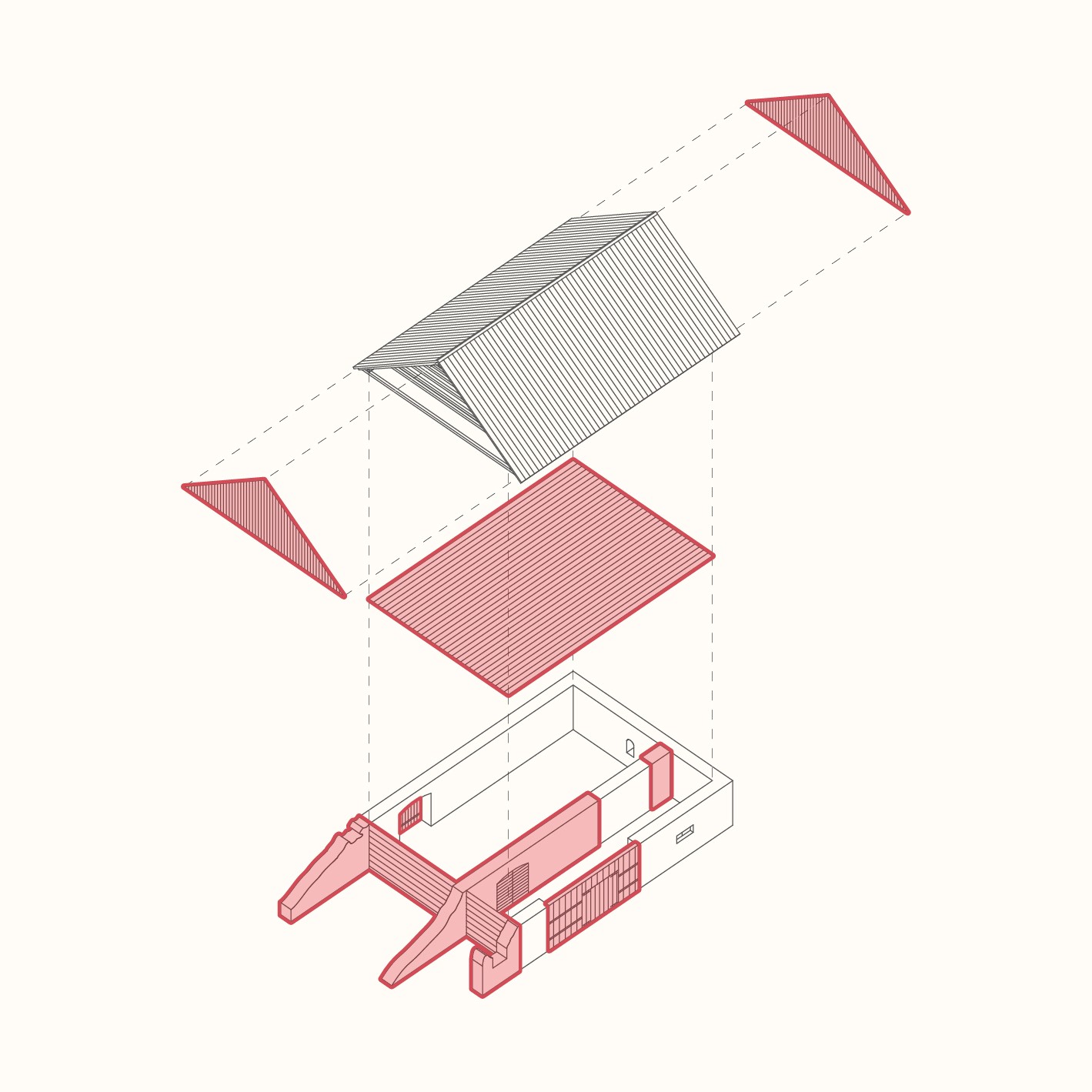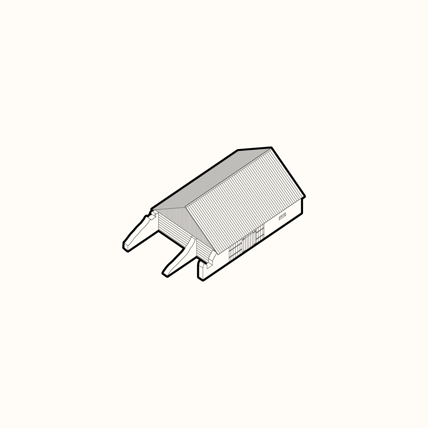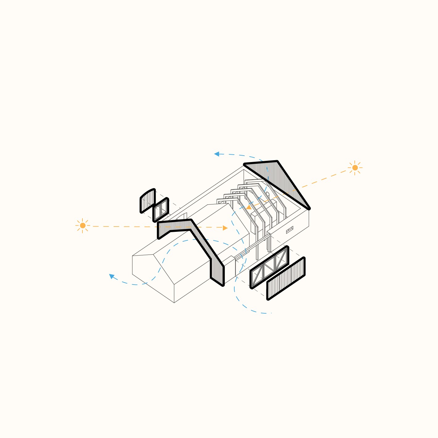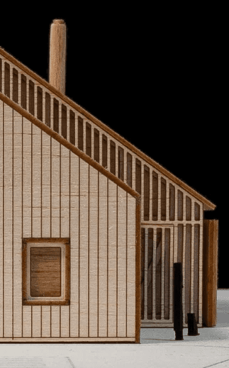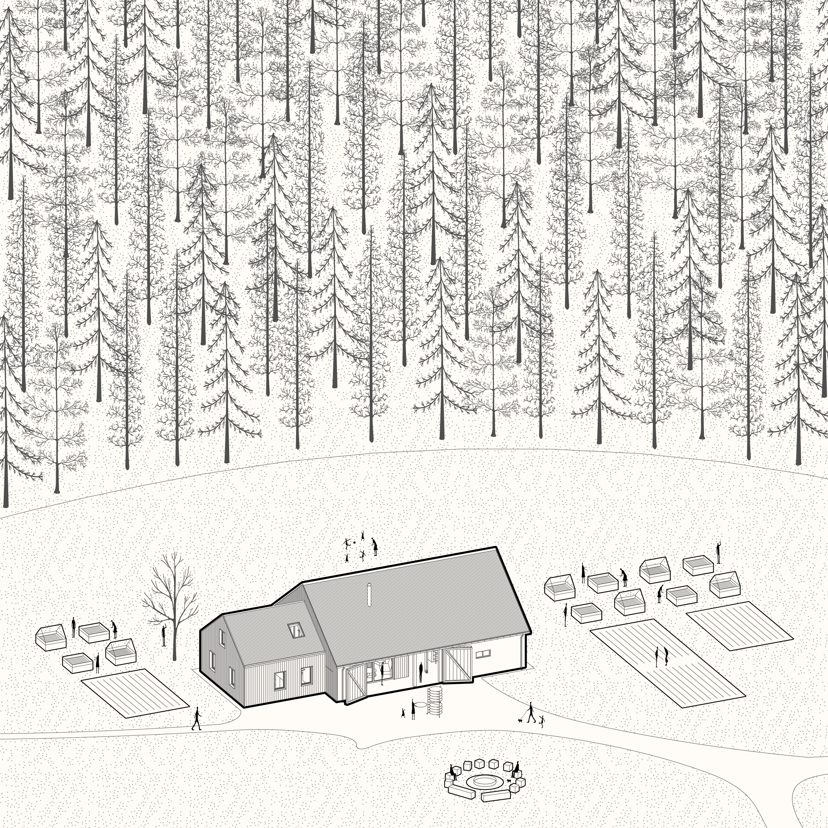 Vložená hmota nabízí ubytování pro hosty, společný obývací prostor s krbem i potřebné zázemí. Odtud se vstupuje přímo do otevřeného prostoru stodoly, vše je blízko a propojené. Obývá se tu dům i stodola zároveň, podle denního rytmu lidí, práce a světla.