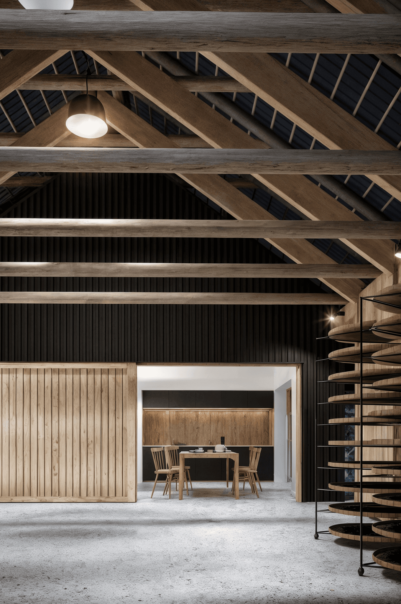 Ve stodole vznikl otevřený multifunkční prostor, který se přirozeně proměňuje podle potřeby dne. Ráno slouží k práci s bylinami, odpoledne k józe a večer k večeři u dlouhého stolu. Světlo vstupuje do krovu přes lamely ve štítech. Díky nim může prostor dýchat a vytváří se prostředí vhodné pro sušení bylin. Celé místo má klidný rytmus a jemnou vůni.