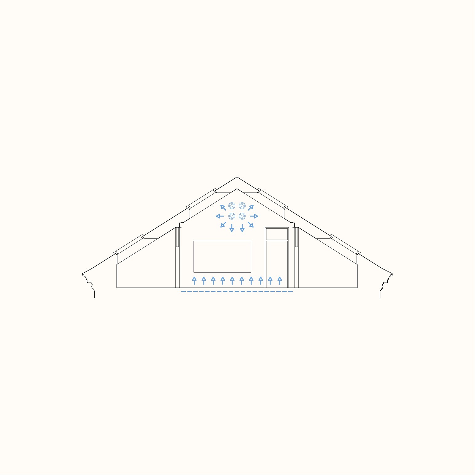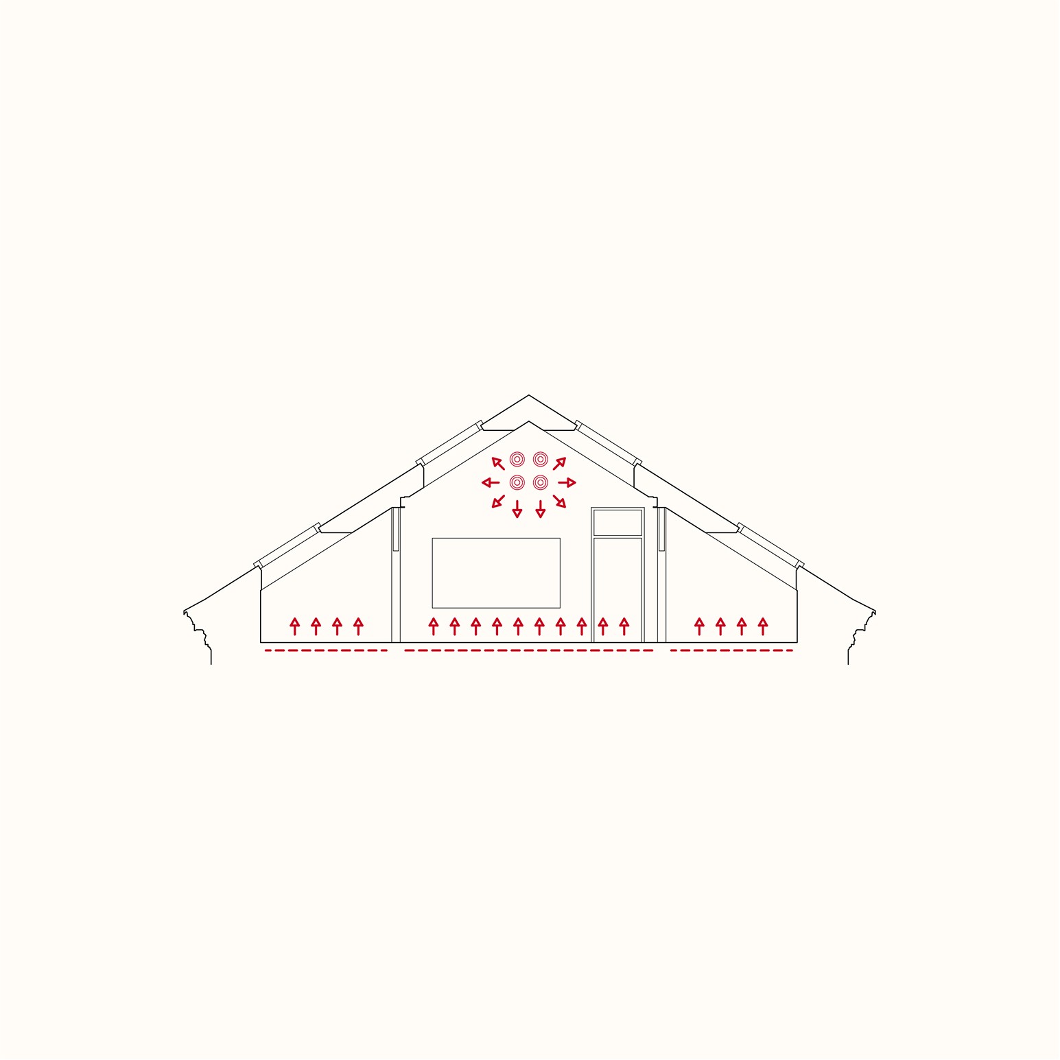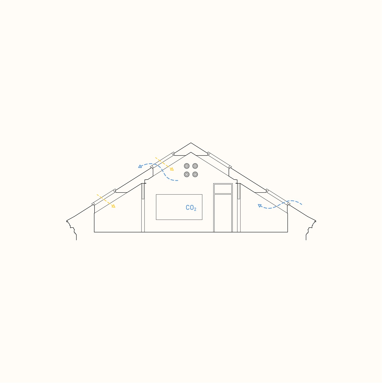 Větrání je řešeno přirozeně, pomocí střešních oken ve dvou výškách, která umožňují příčné provětrání. Součástí systému jsou i čidla CO₂, která pomáhají udržovat čerstvý vzduch a zdravé prostředí. Teplo zajišťuje podlahové vytápění s možností napojení na tepelné čerpadlo a fotovoltaiku. V letních měsících pomáhají tiché kanálové jednotky, které chladí bez průvanu. Akustický komfort zajišťují dřevěné povrchy, přírodní heraklith a měkké textilní prvky. Vše je nastavené tak, aby byl vzduch čistý, teplota stabilní a technika nerušila výuku.