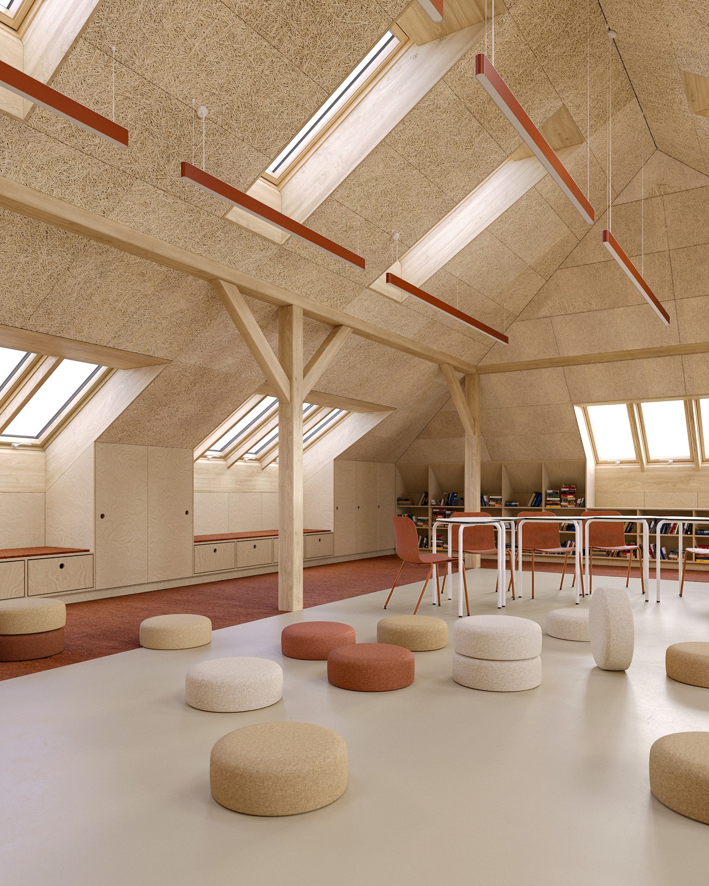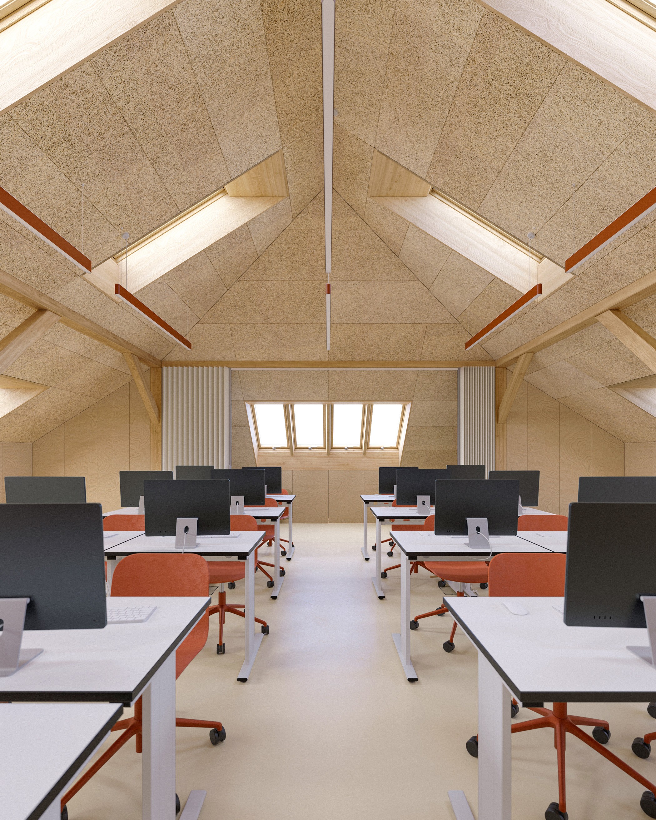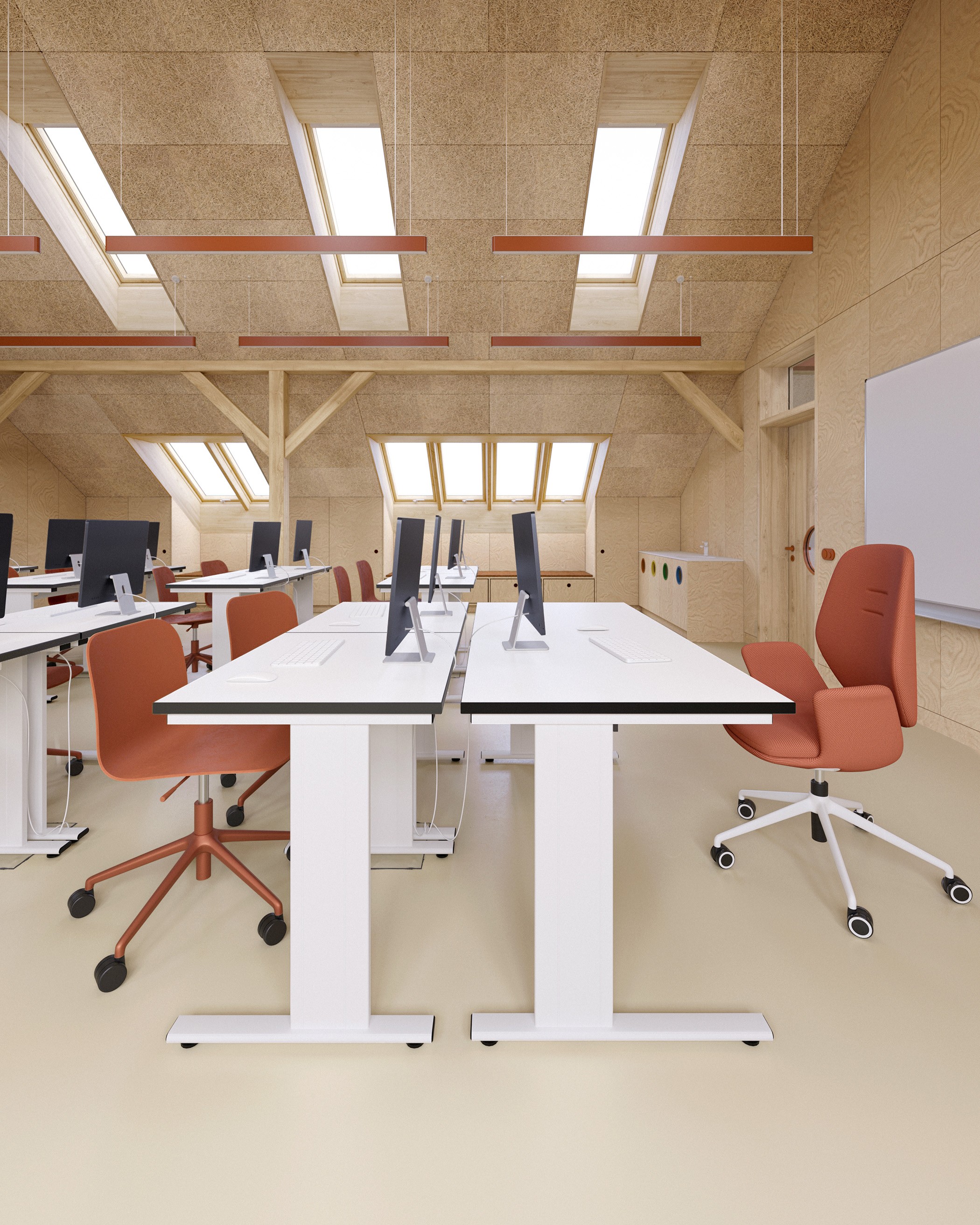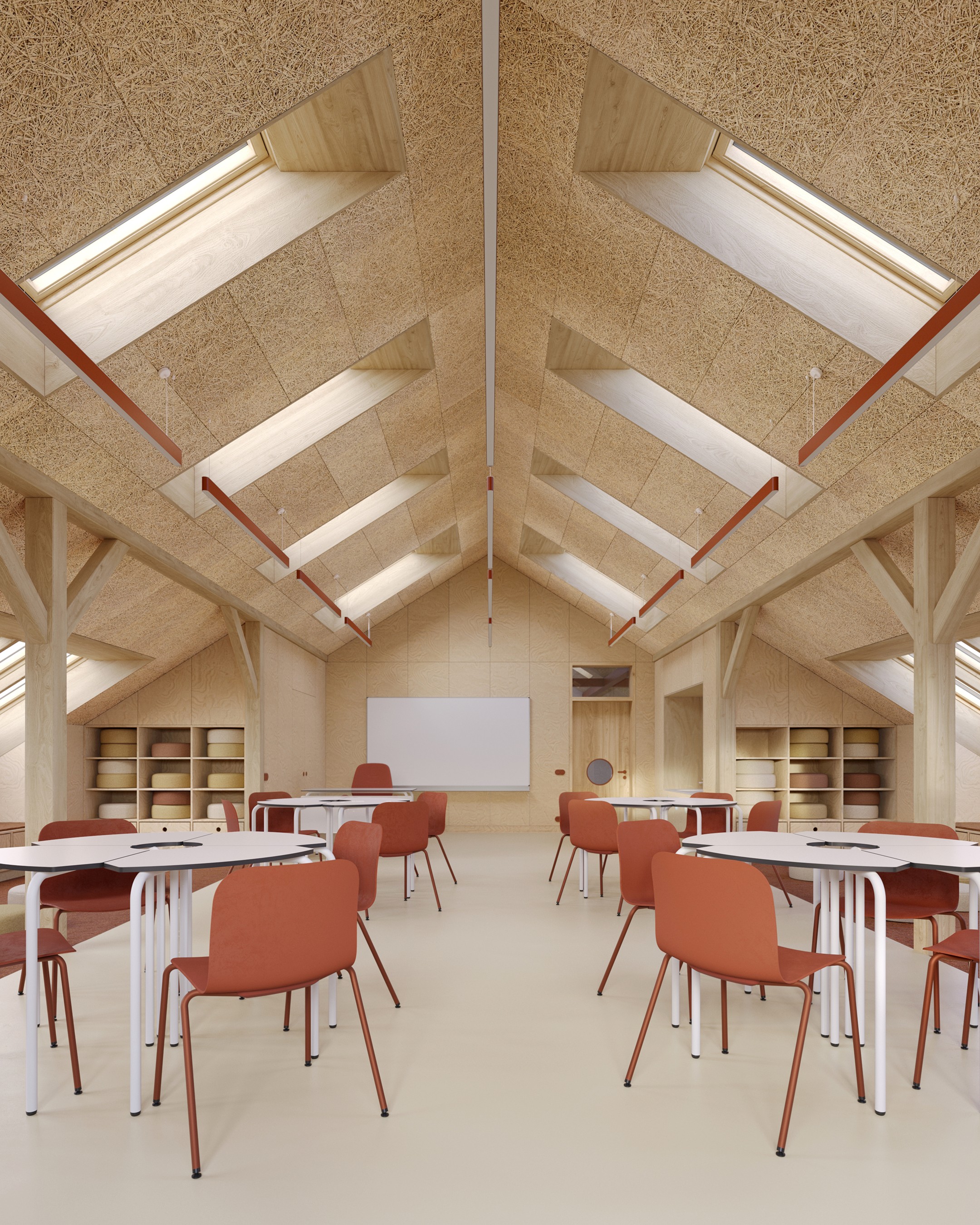 Základem návrhu je světlo, dřevo a jednoduchost. Celý prostor jsme otevřeli a prosvětlili dvěma řadami střešních oken. Vybírali jsme materiály, které jsou trvanlivé, příjemné na dotek a působí klidně. Každá učebna má jasnou logiku, měřítko a atmosféru, která dětem pomáhá cítit se dobře a bezpečně.