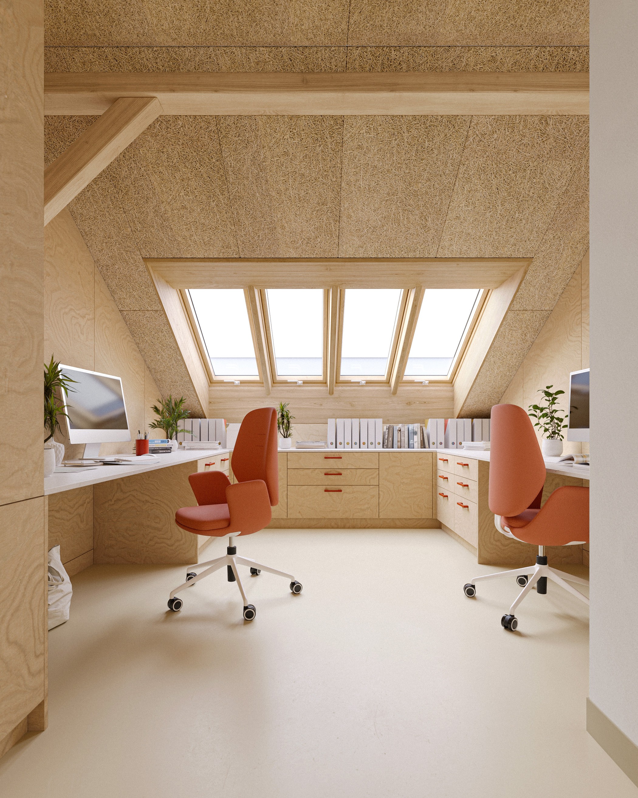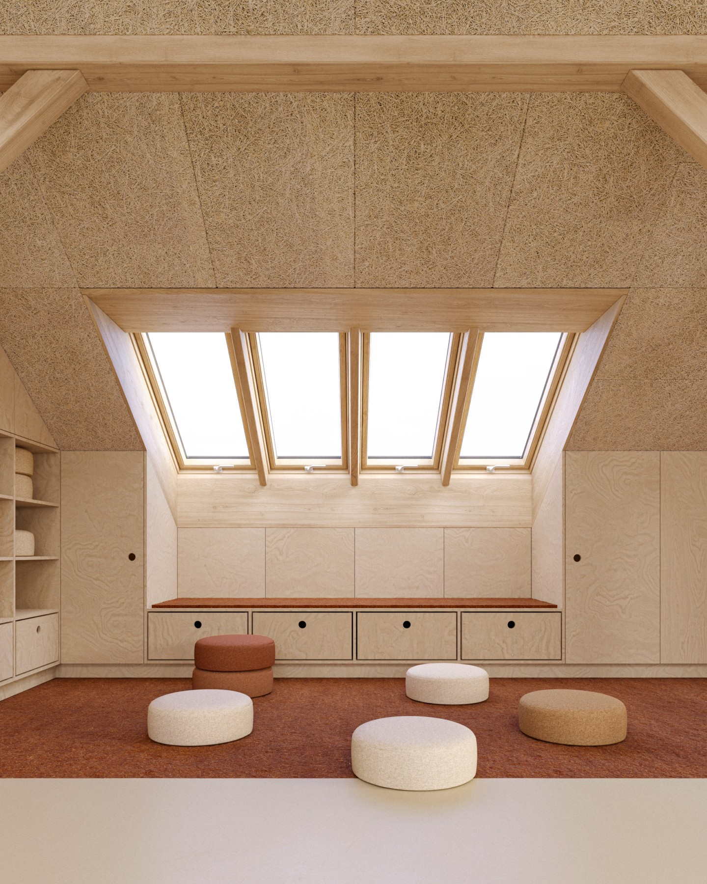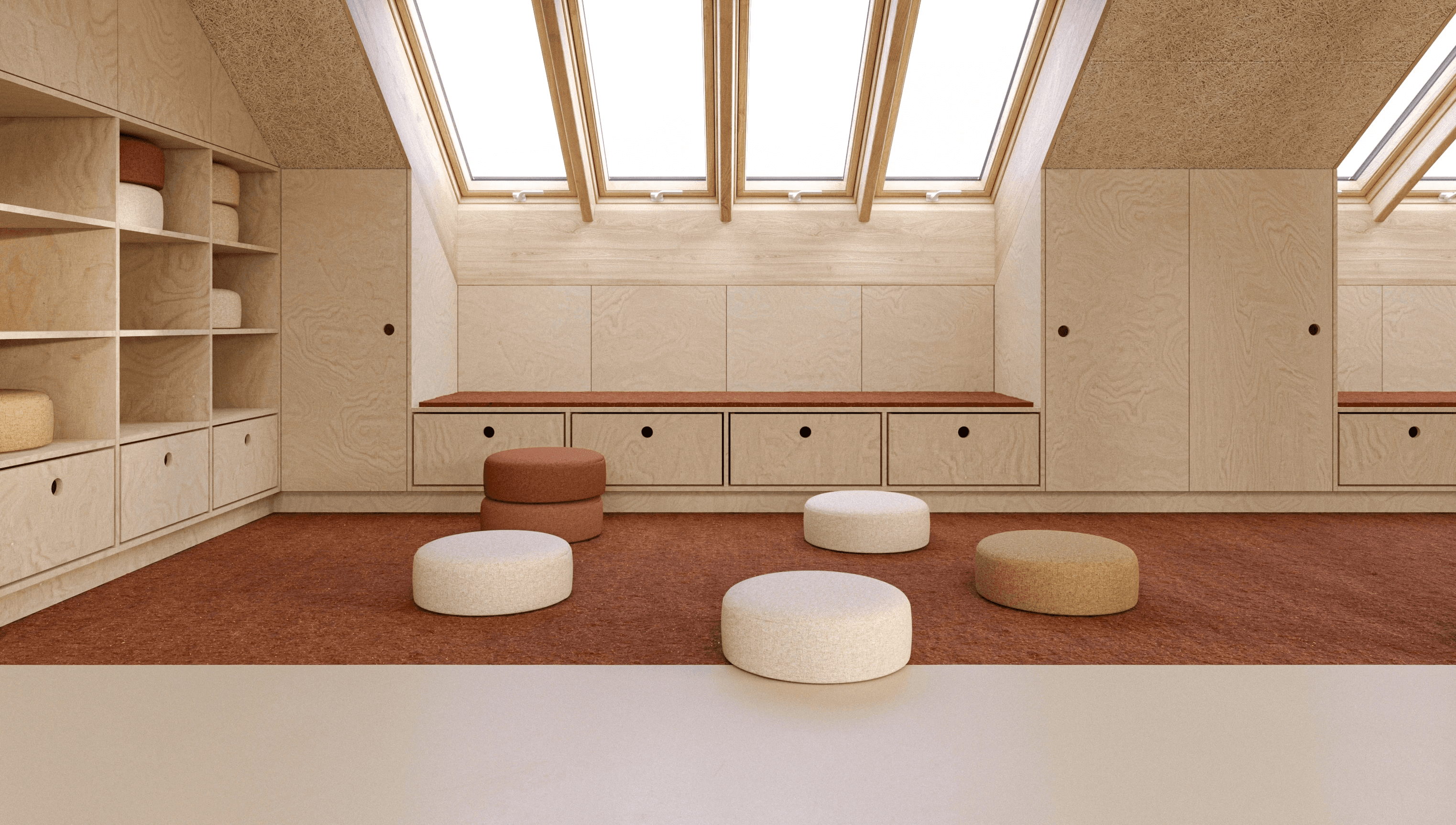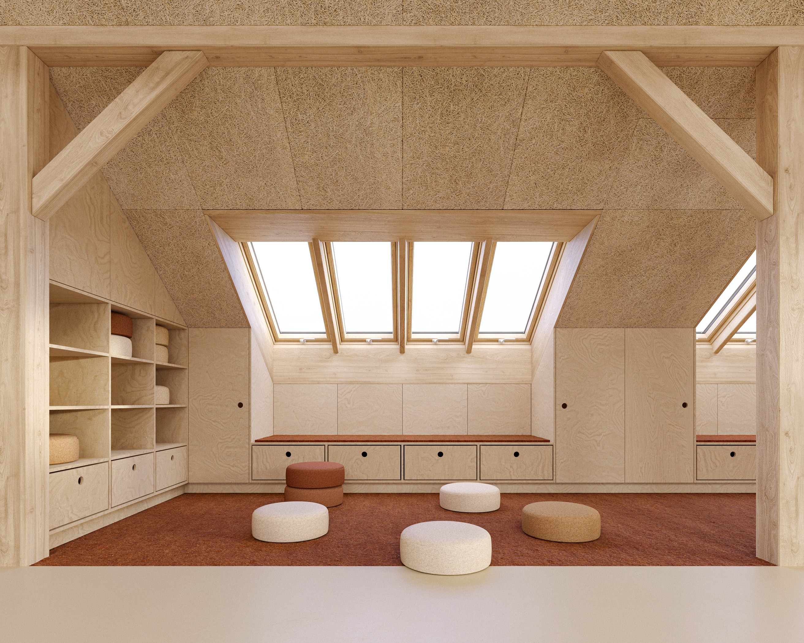 Základem návrhu je světlo, dřevo a jednoduchost. Celý prostor jsme otevřeli a prosvětlili dvěma řadami střešních oken. Vybírali jsme materiály, které jsou trvanlivé, příjemné na dotek a působí klidně. Každá učebna má jasnou logiku, měřítko a atmosféru, která dětem pomáhá cítit se dobře a bezpečně.