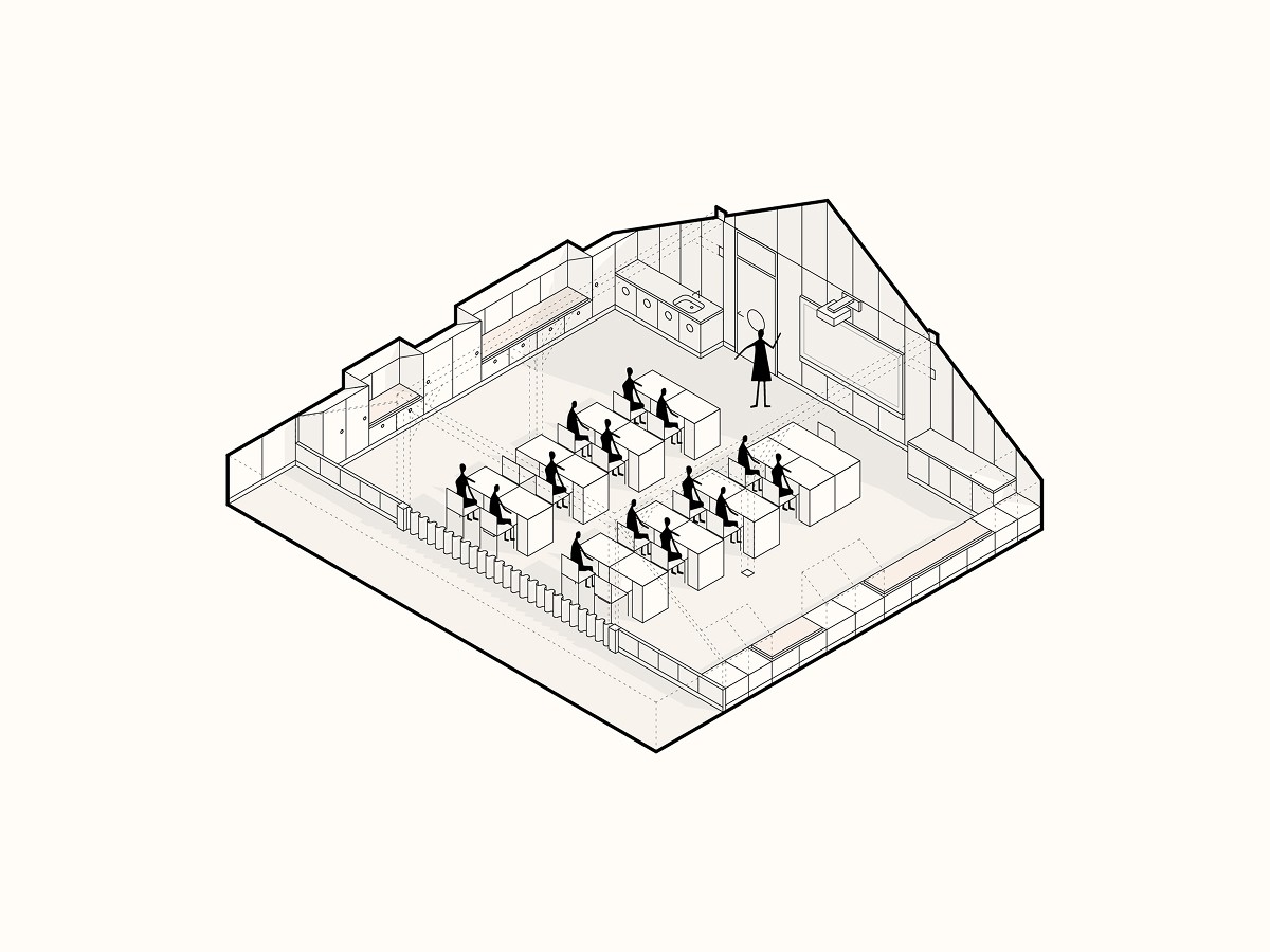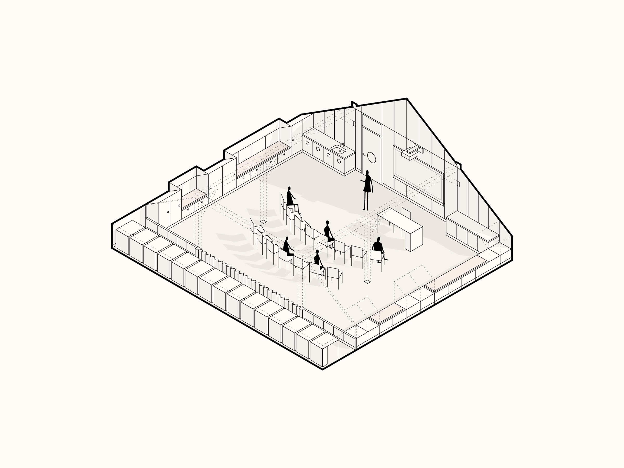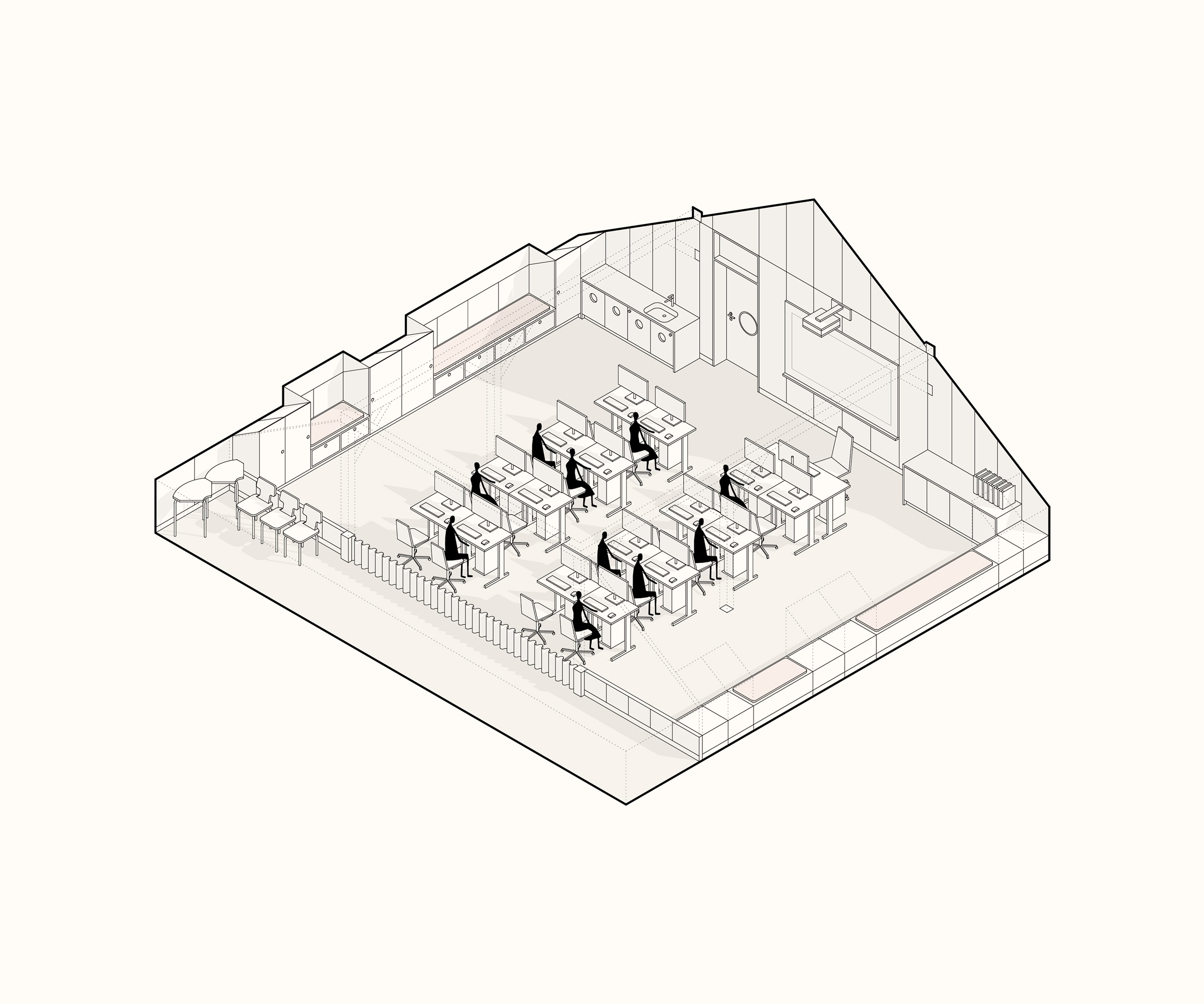 Podkroví staré školy bylo roky prázdné. Dnes však škola potřebuje navýšit kapacitu pro nové žáky. Spolu s obcí a vedením školy jsme proto v podkroví navrhli nové učebny, kabinety a zázemí. Šlo nám o smysluplné využití prostoru, který budova už nabízí. Cílem byl interiér, kde se dětem dobře dýchá, kde se snadno soustředí a kde je cítit respekt k původnímu domu.