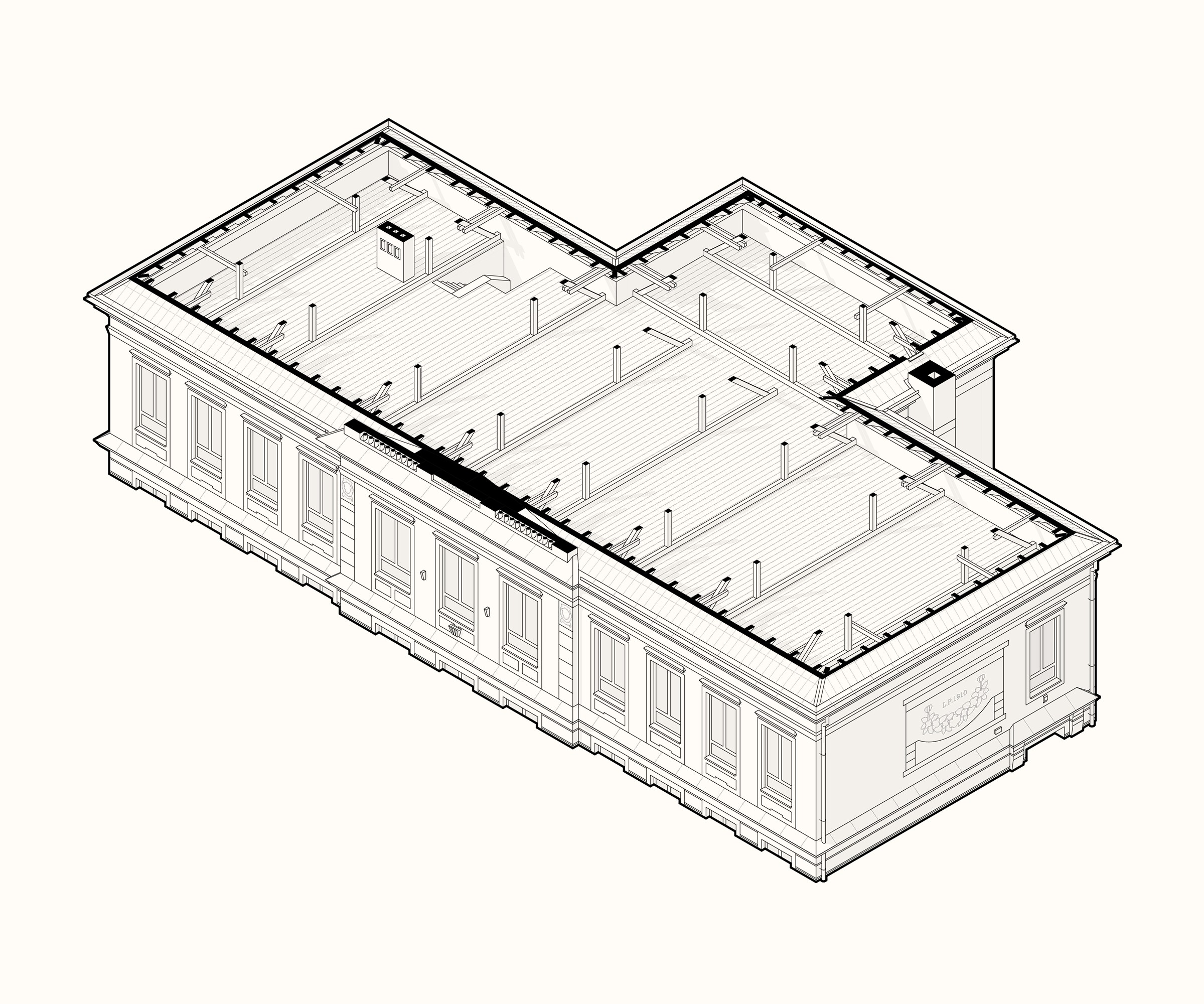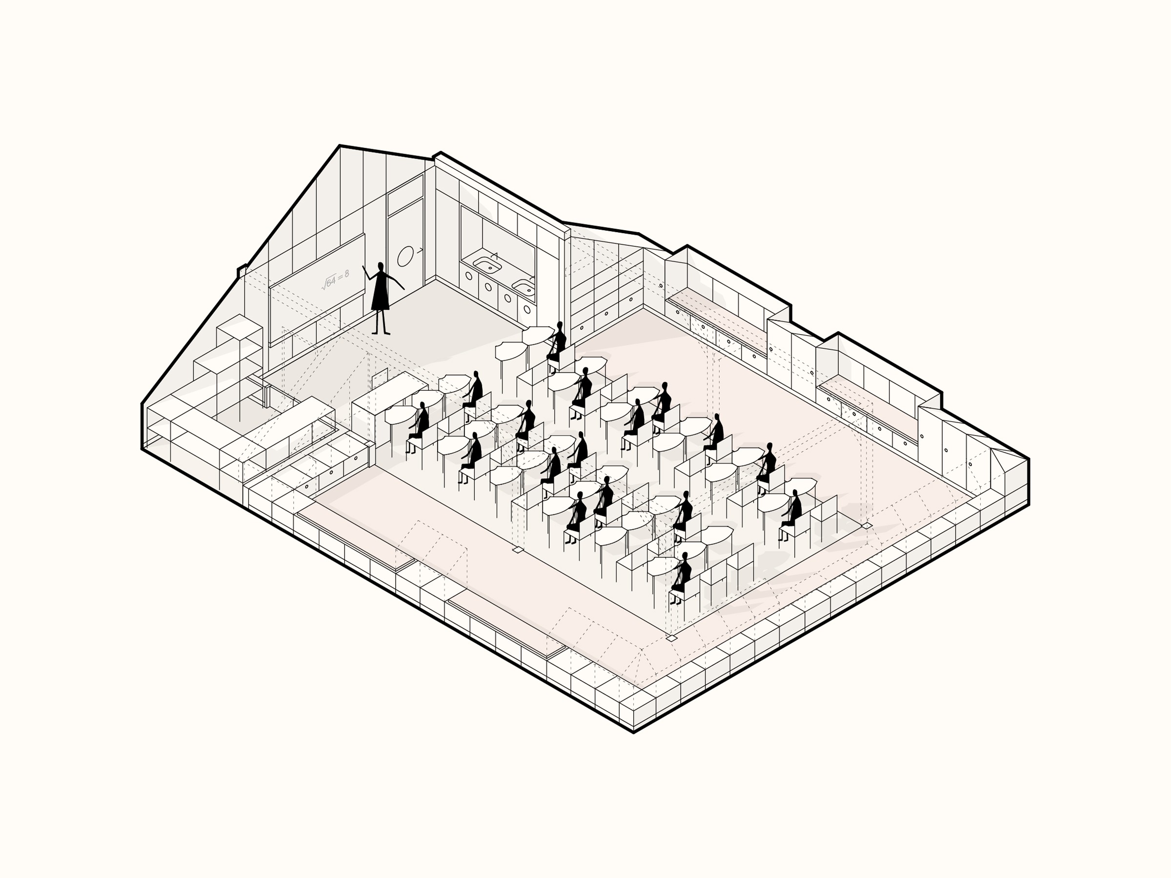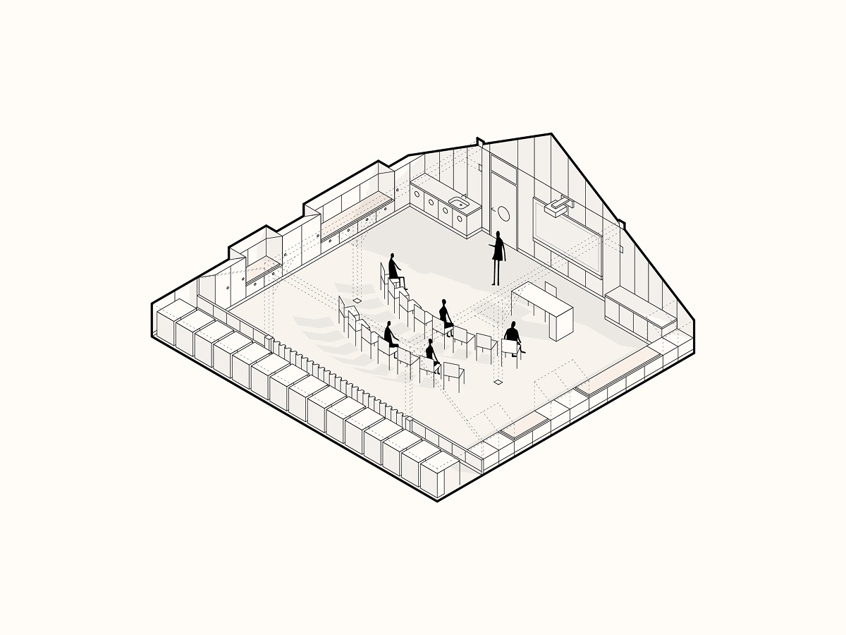 Podkroví staré školy bylo roky prázdné. Dnes však škola potřebuje navýšit kapacitu pro nové žáky. Spolu s obcí a vedením školy jsme proto v podkroví navrhli nové učebny, kabinety a zázemí. Šlo nám o smysluplné využití prostoru, který budova už nabízí. Cílem byl interiér, kde se dětem dobře dýchá, kde se snadno soustředí a kde je cítit respekt k původnímu domu.