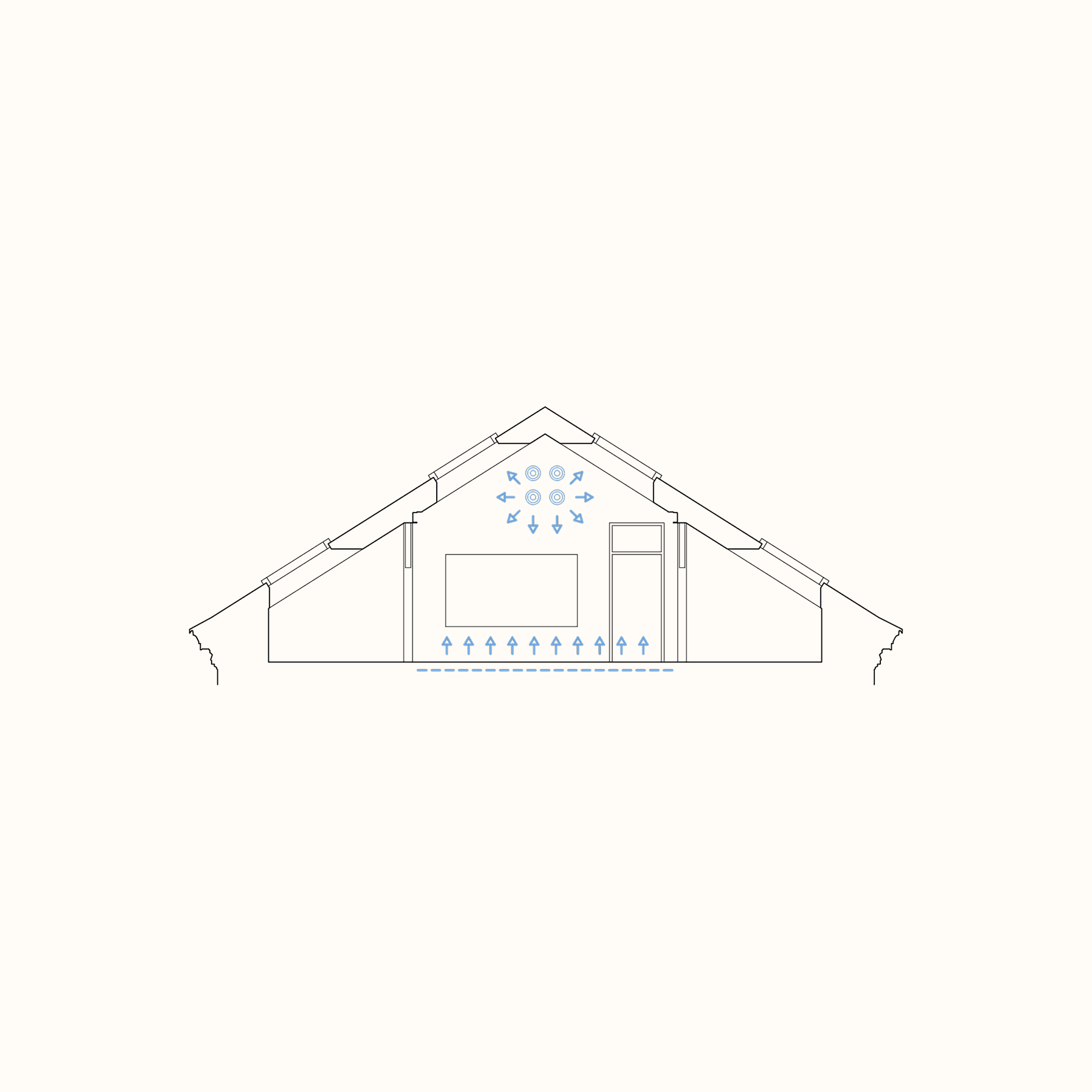 Větrání je řešeno přirozeně pomocí střešních oken ve dvou výškách, která umožňují příčné provětrání. Součástí systému jsou i čidla CO₂, která pomáhají udržovat čerstvý vzduch a zdravé prostředí. Teplo zajišťuje podlahové vytápění s možností napojení na tepelné čerpadlo a fotovoltaiku. V letních měsících pomáhají tiché kanálové jednotky, které chladí bez průvanu. Akustický komfort zajišťují dřevěné povrchy, přírodní heraklith a měkké textilní prvky. Vše je nastavené tak, aby byl vzduch čistý, teplota stabilní a technika nerušila výuku.