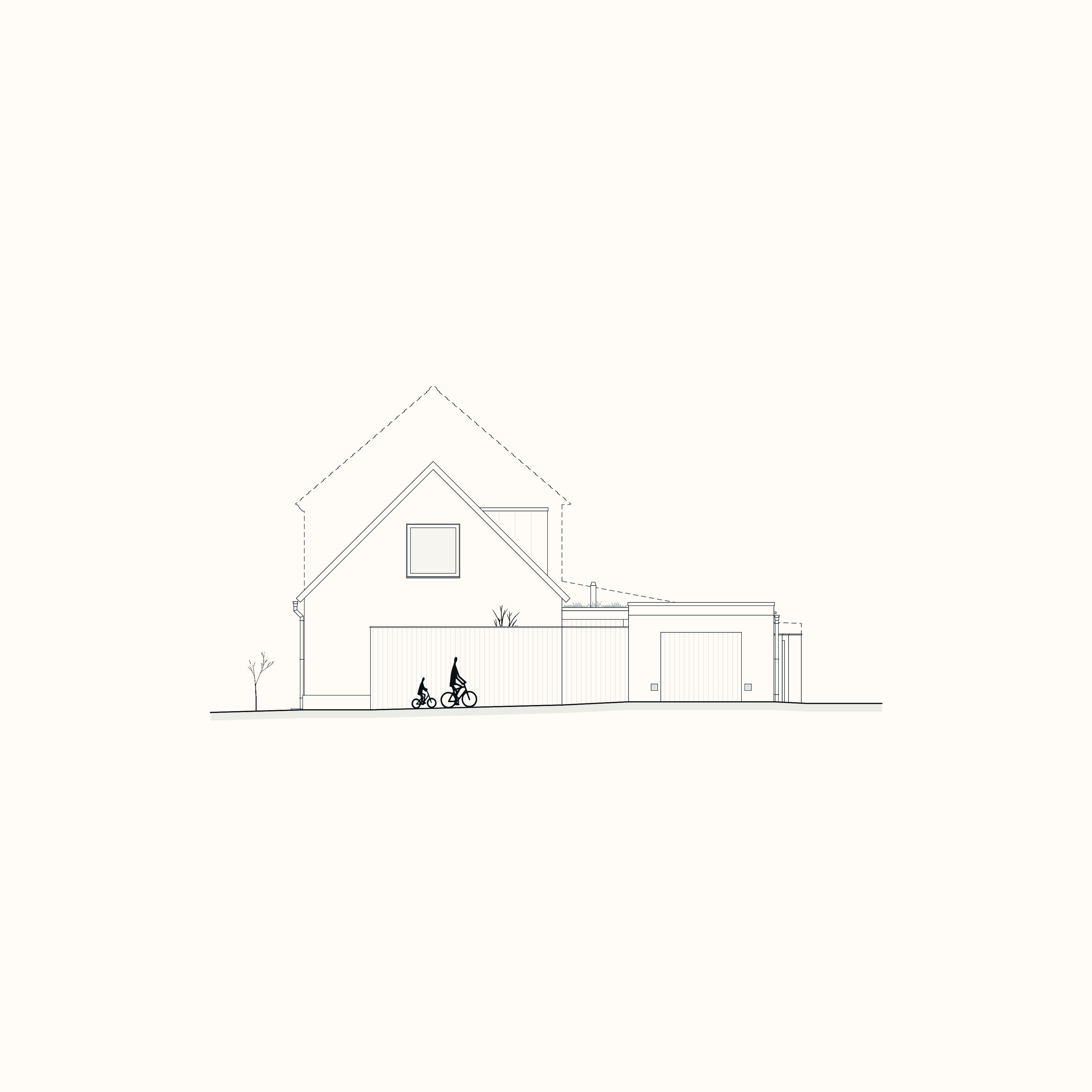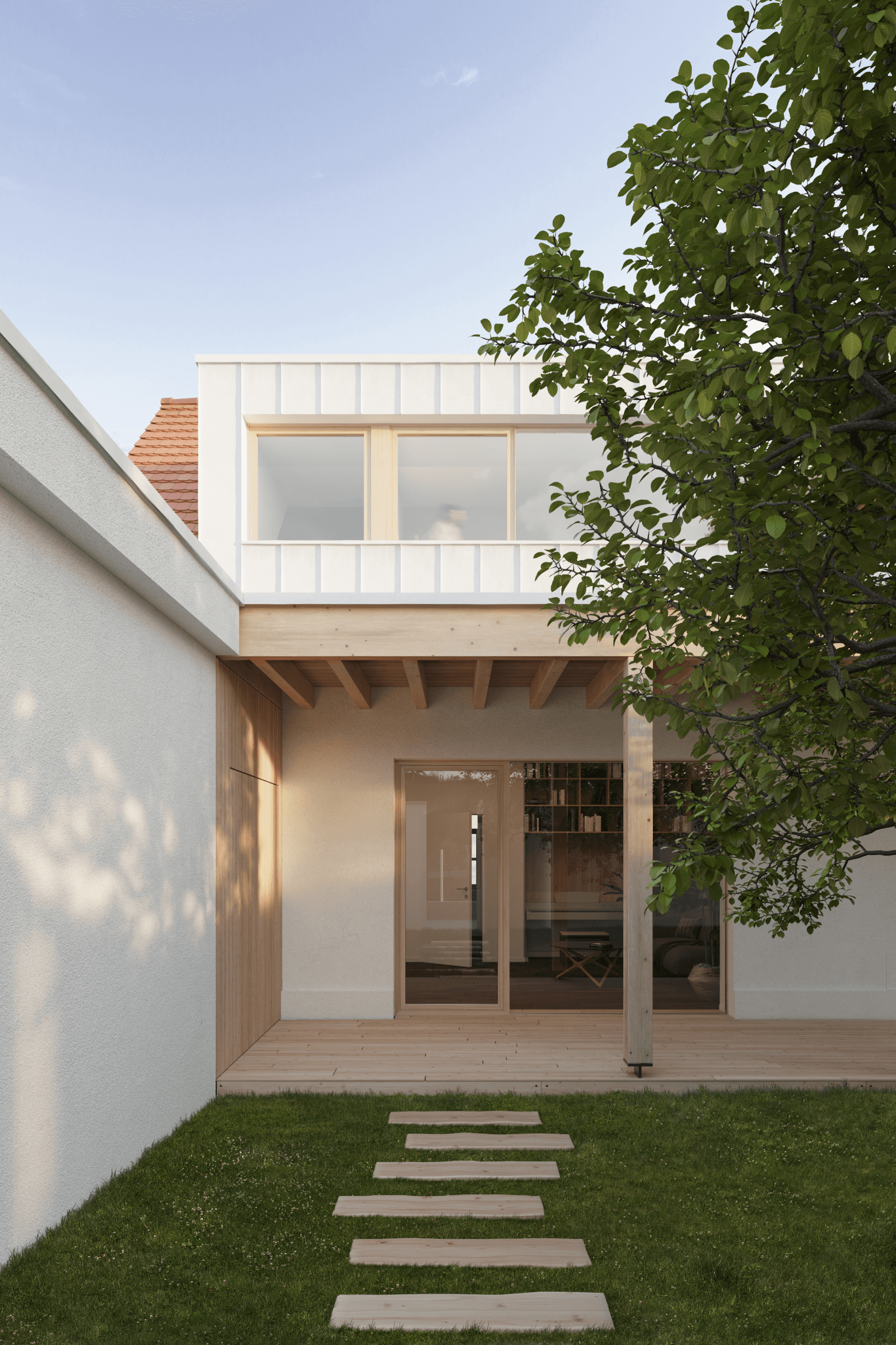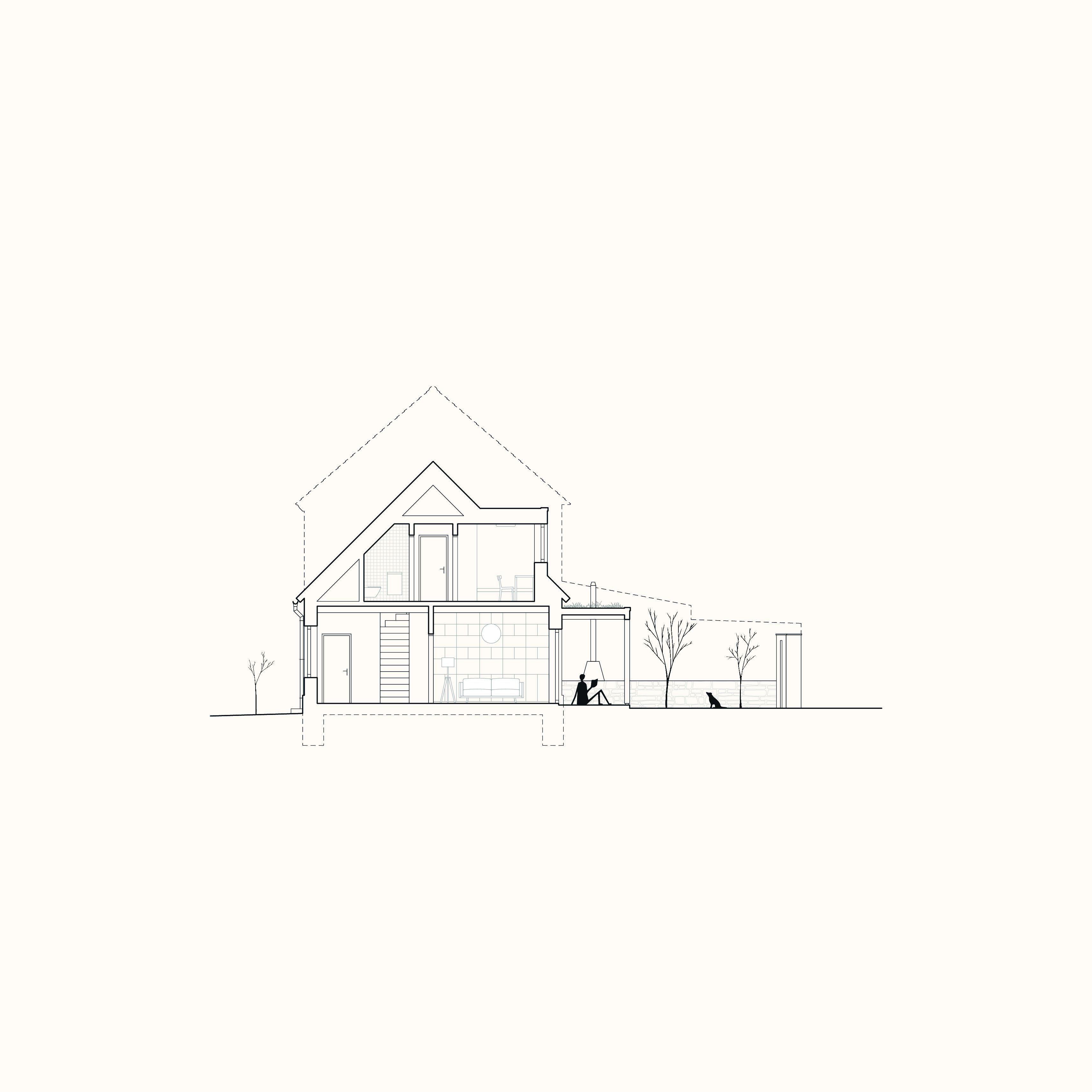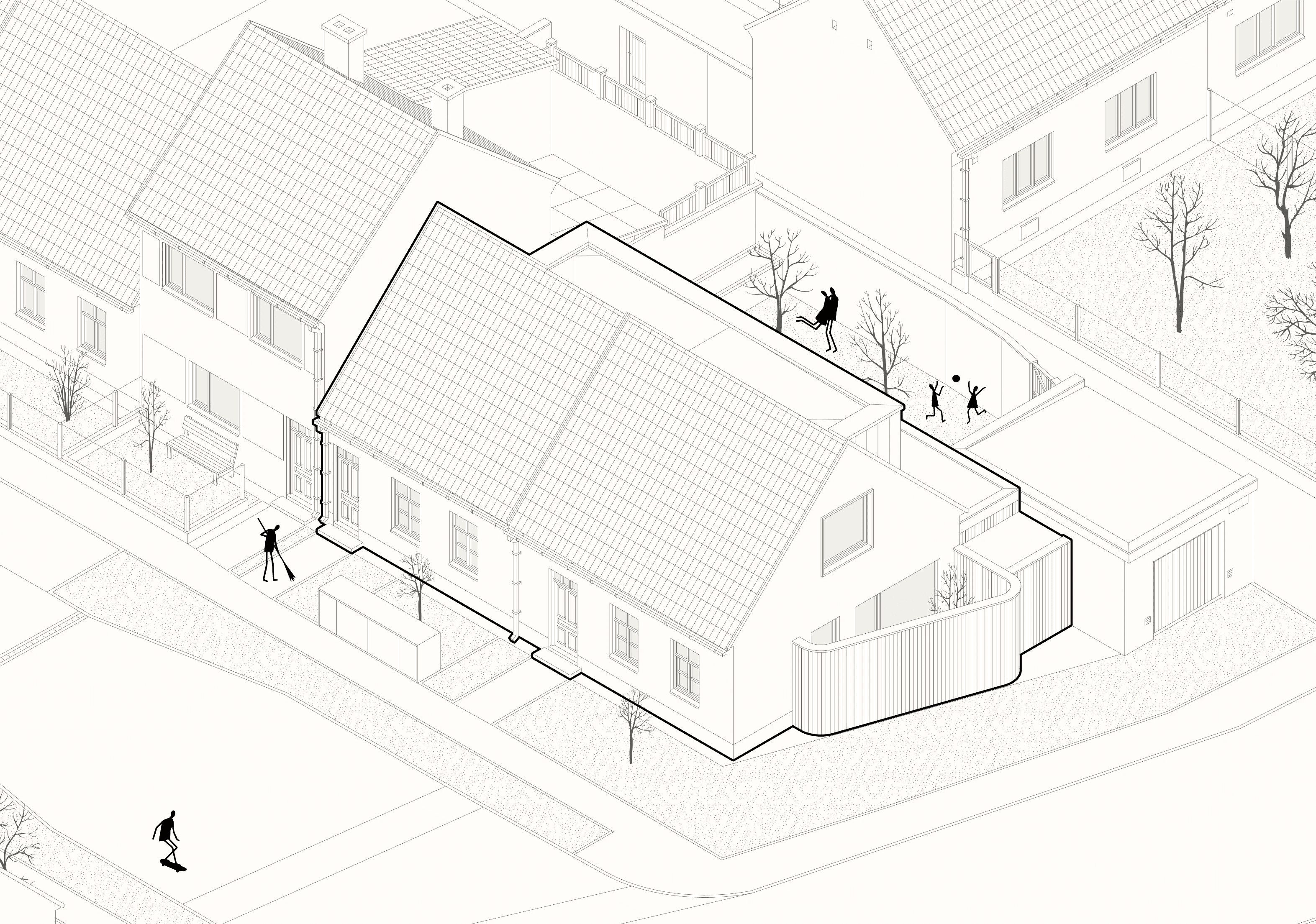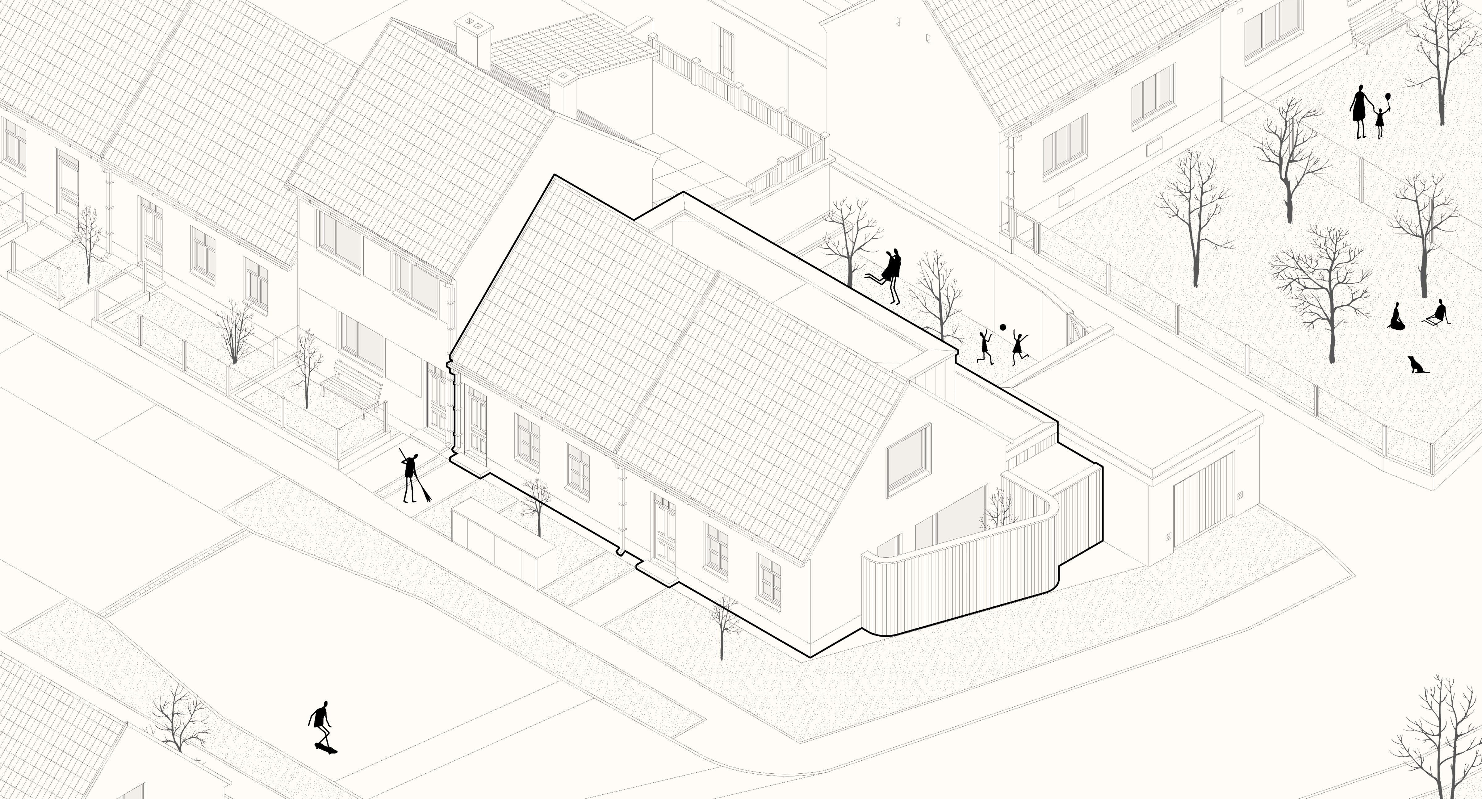 Směr dostavby určilo samo místo. Ulice má jasný rytmus starých hornických domků, proto dům rozšiřujeme jednoduchou hmotou se sedlovou střechou. Středem návrhu je společenský prostor propojený se zahradou. Odtud se dům přirozeně rozvíjí dál. Do ateliéru, dílny a do klidného patra pro celou rodinu. Vzniká tak domov, který drží pohromadě to společné i to osobní.