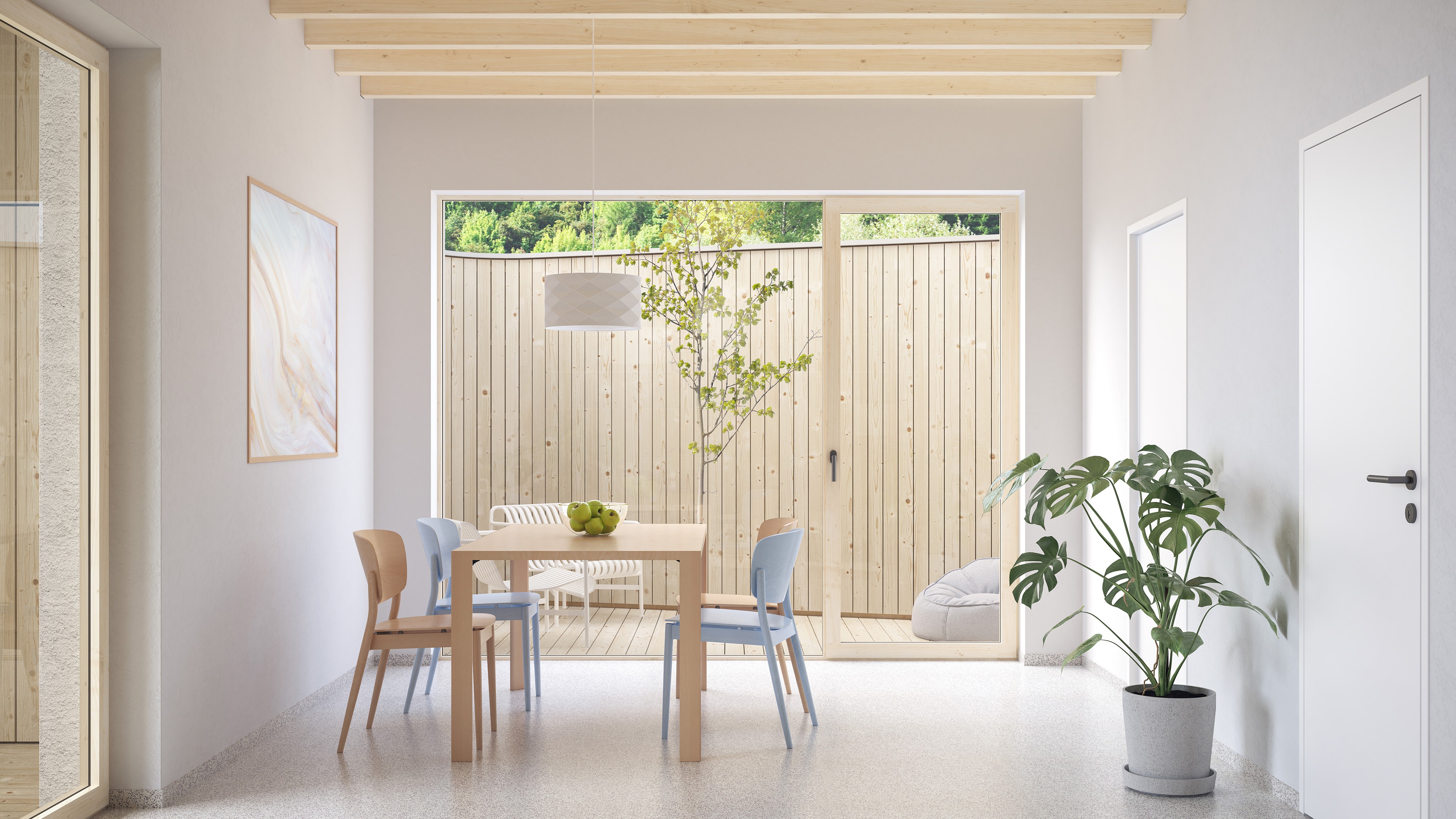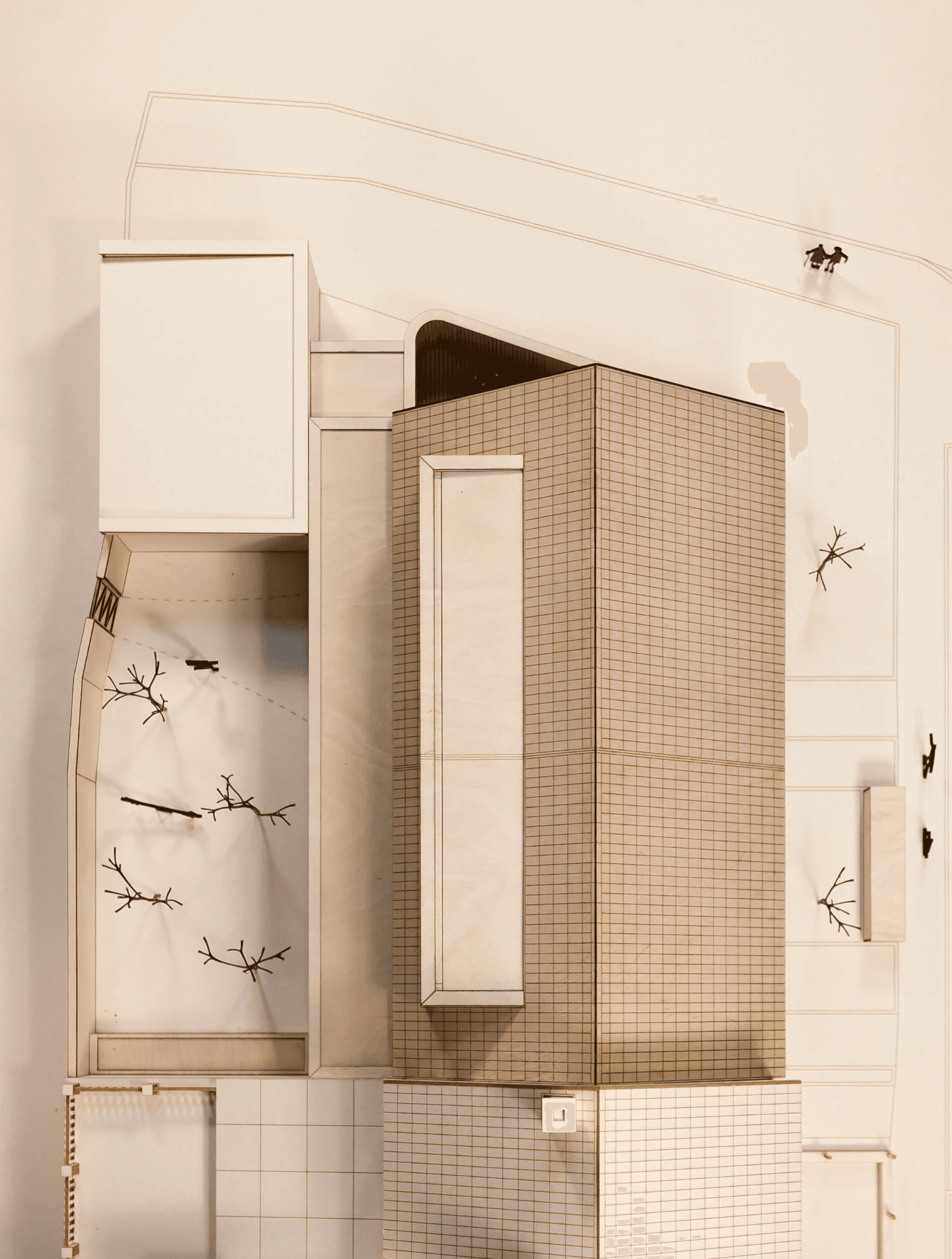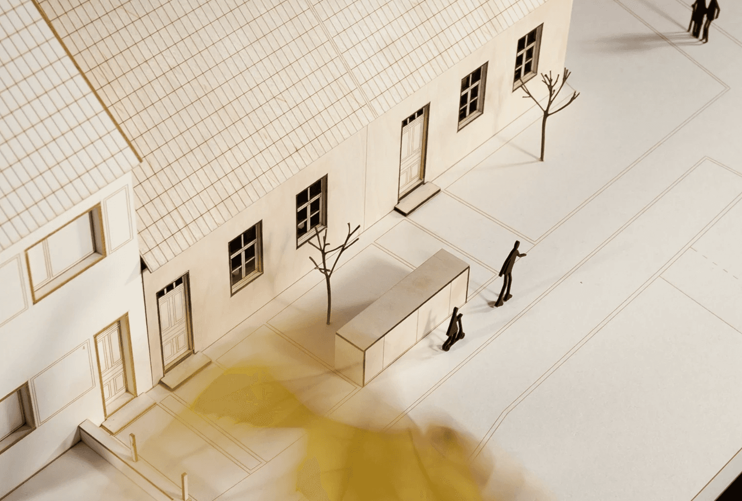 Atrium před domem je chráněný prostor odstíněný od ruchu ulice. Společenský prostor díky němu dýchá ven, ale má své soukromí. A když jde kolem známý, může zaklepat a posedět tu na kávu, aniž by musel procházet celý dům.