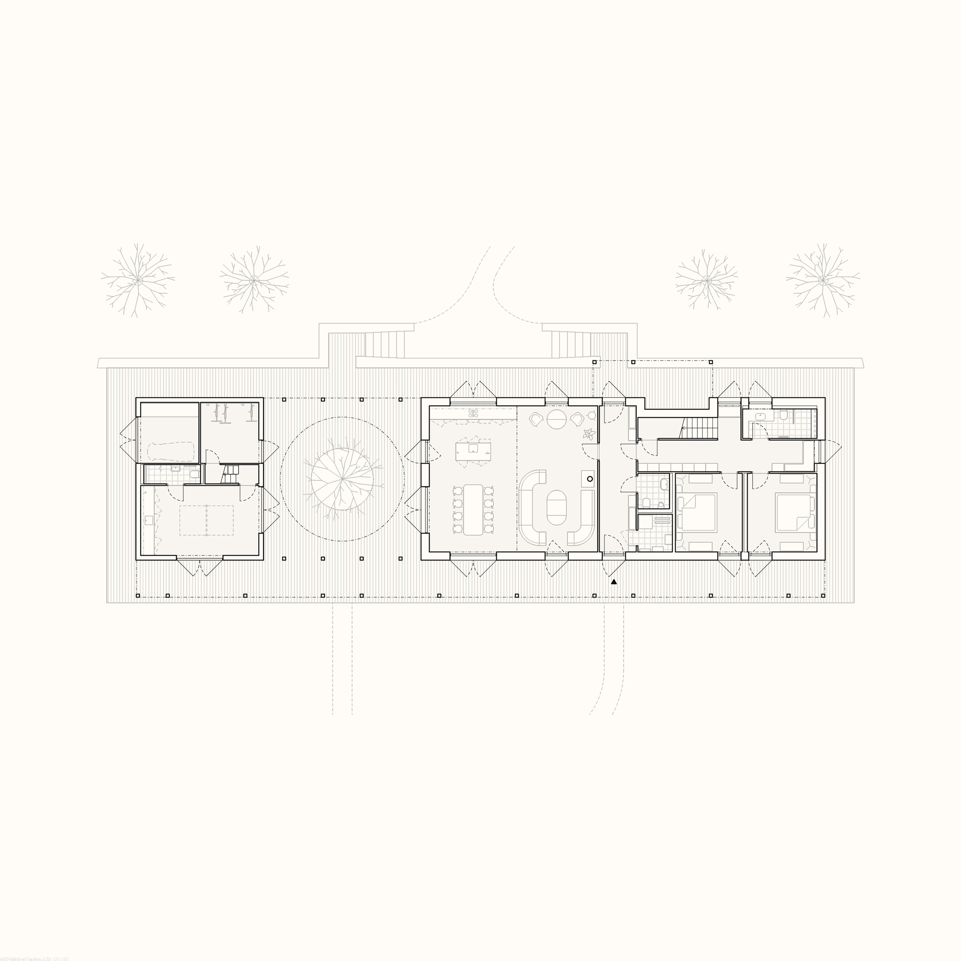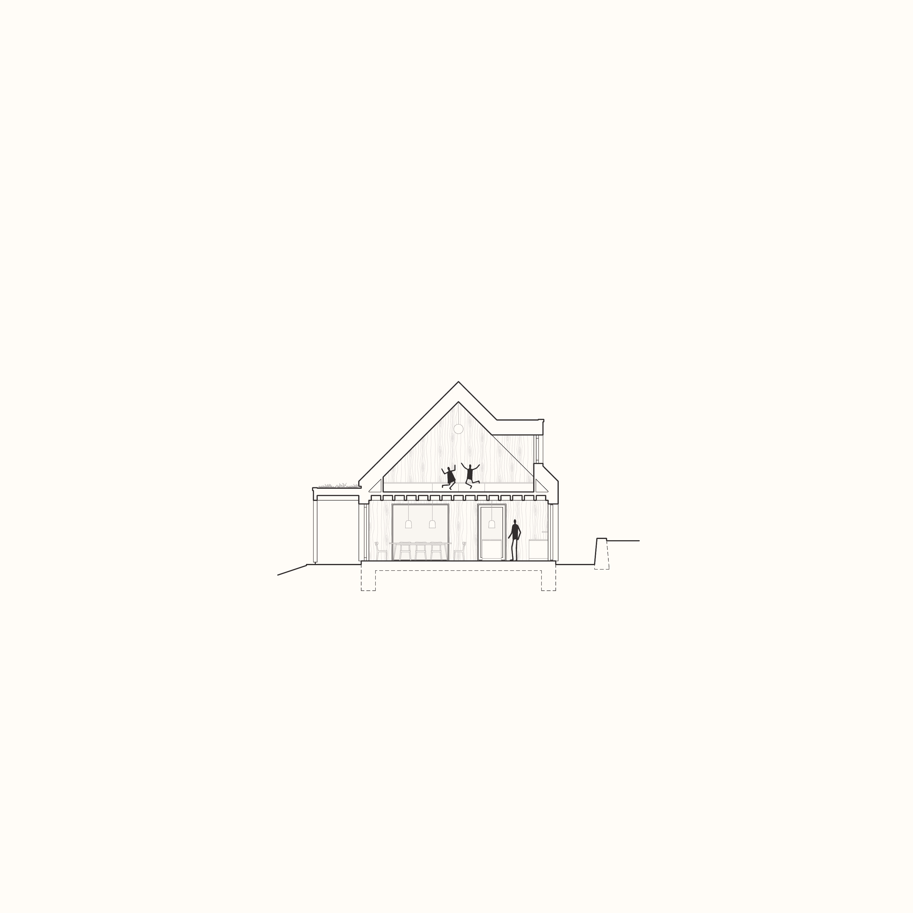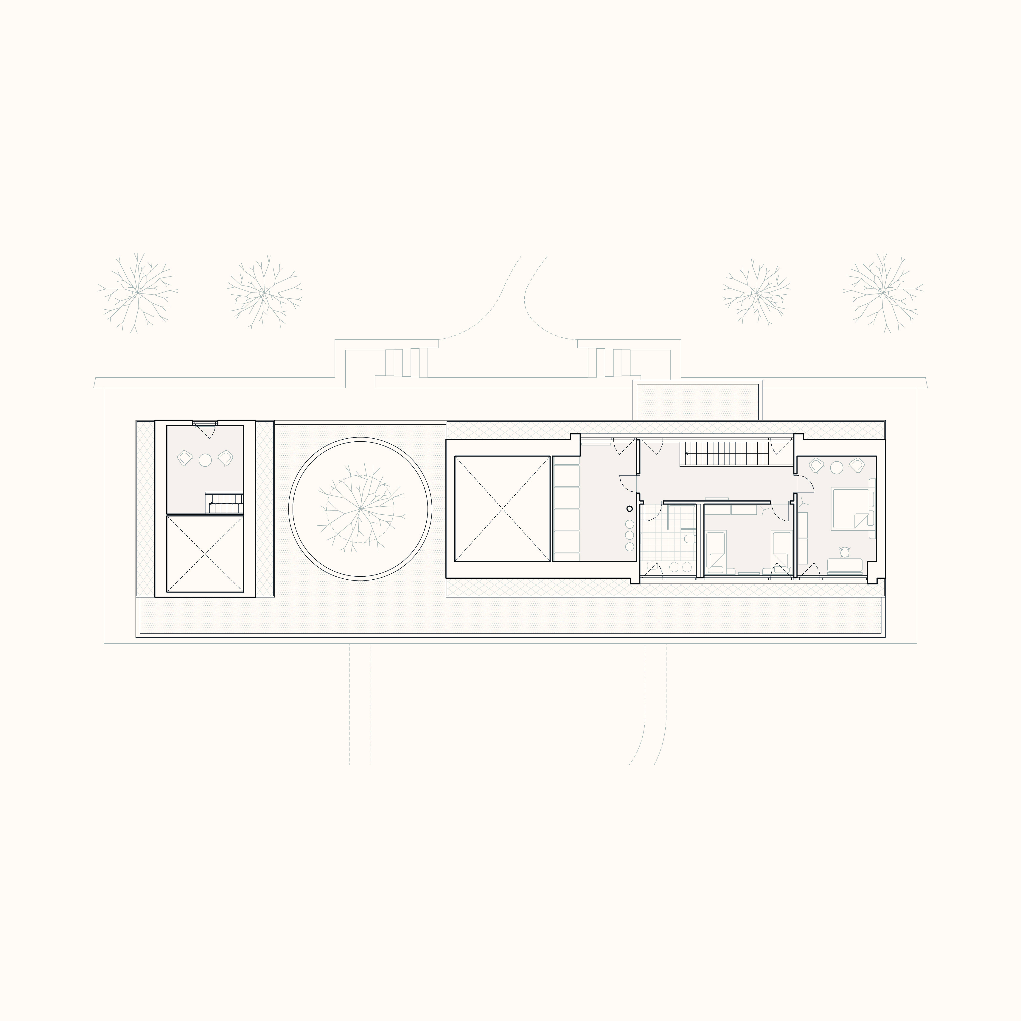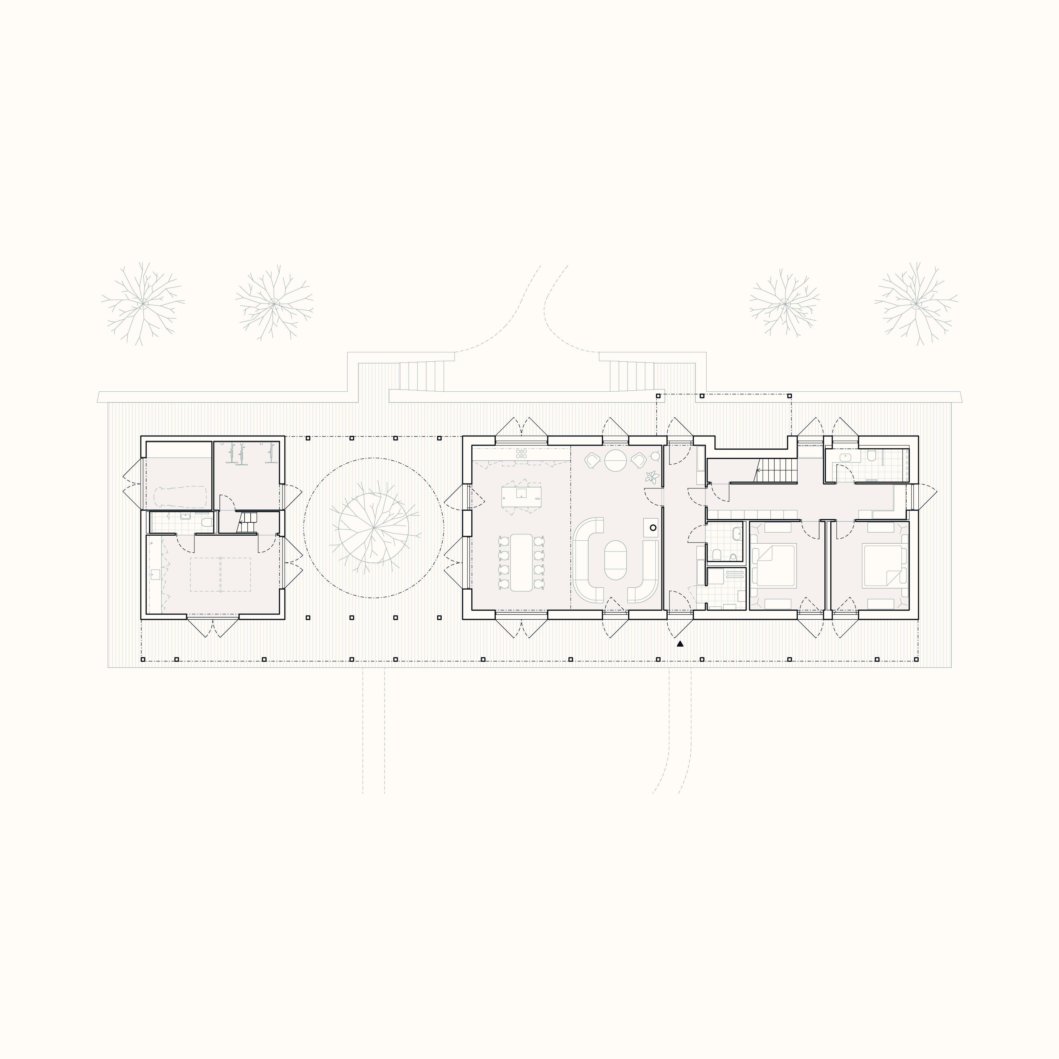 Dům jsme pojali jako dvojici podélných hmot s tradiční sedlovou střechou, které dohromady vytvářejí klidnou a harmonickou kompozici v krajině. Propojuje je horizontální konstrukce s vegetační střechou, která v přízemí tvoří zápraží a přirozené stínění. V místě mezi hmotami, kde je konstrukce otevřena vzniká kruh, jímž prochází strom. Ten se stává přirozeným centrem dění, kolem kterého se dá posedět, zavěsit hamaku nebo promítat letní kino.