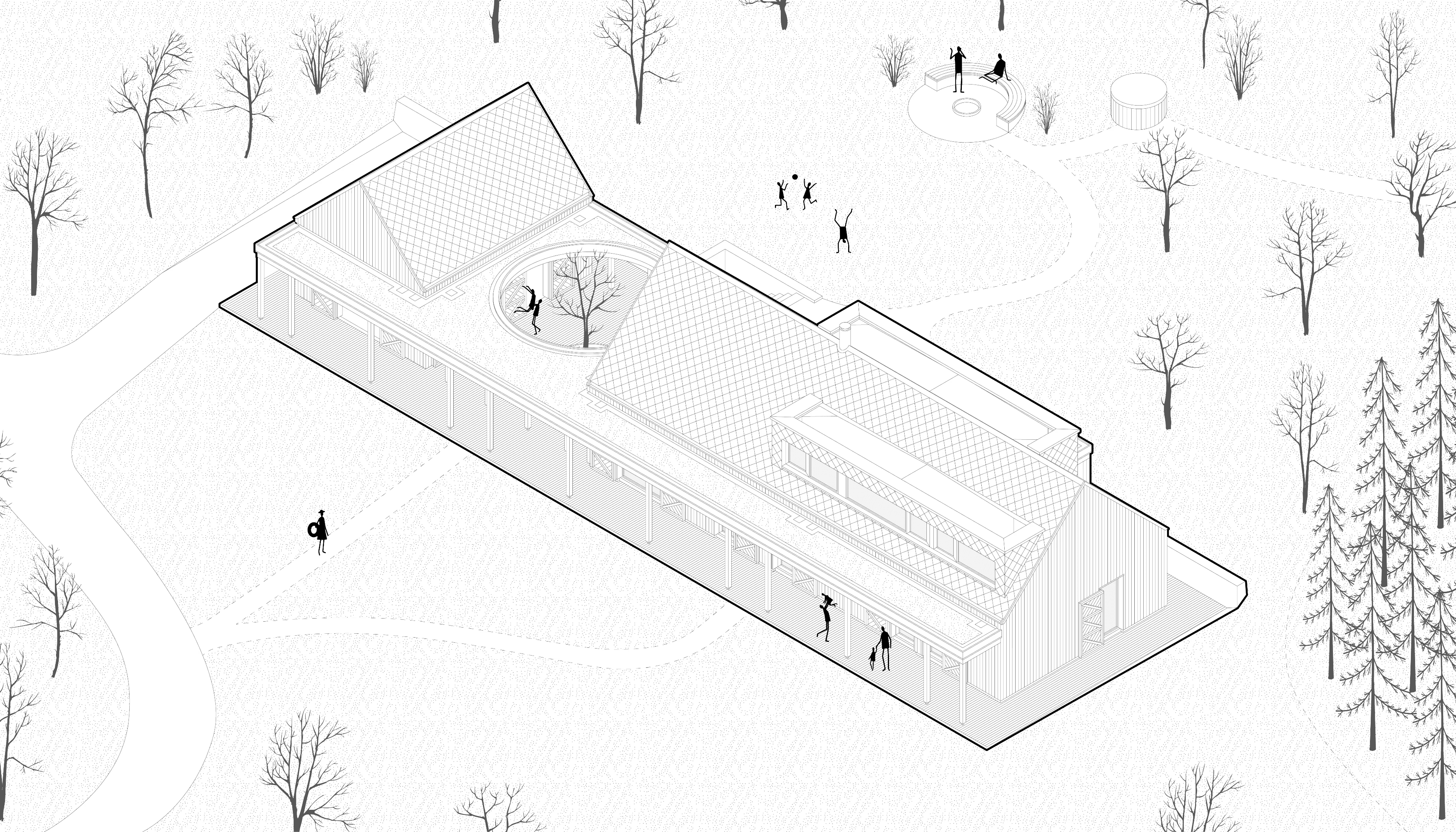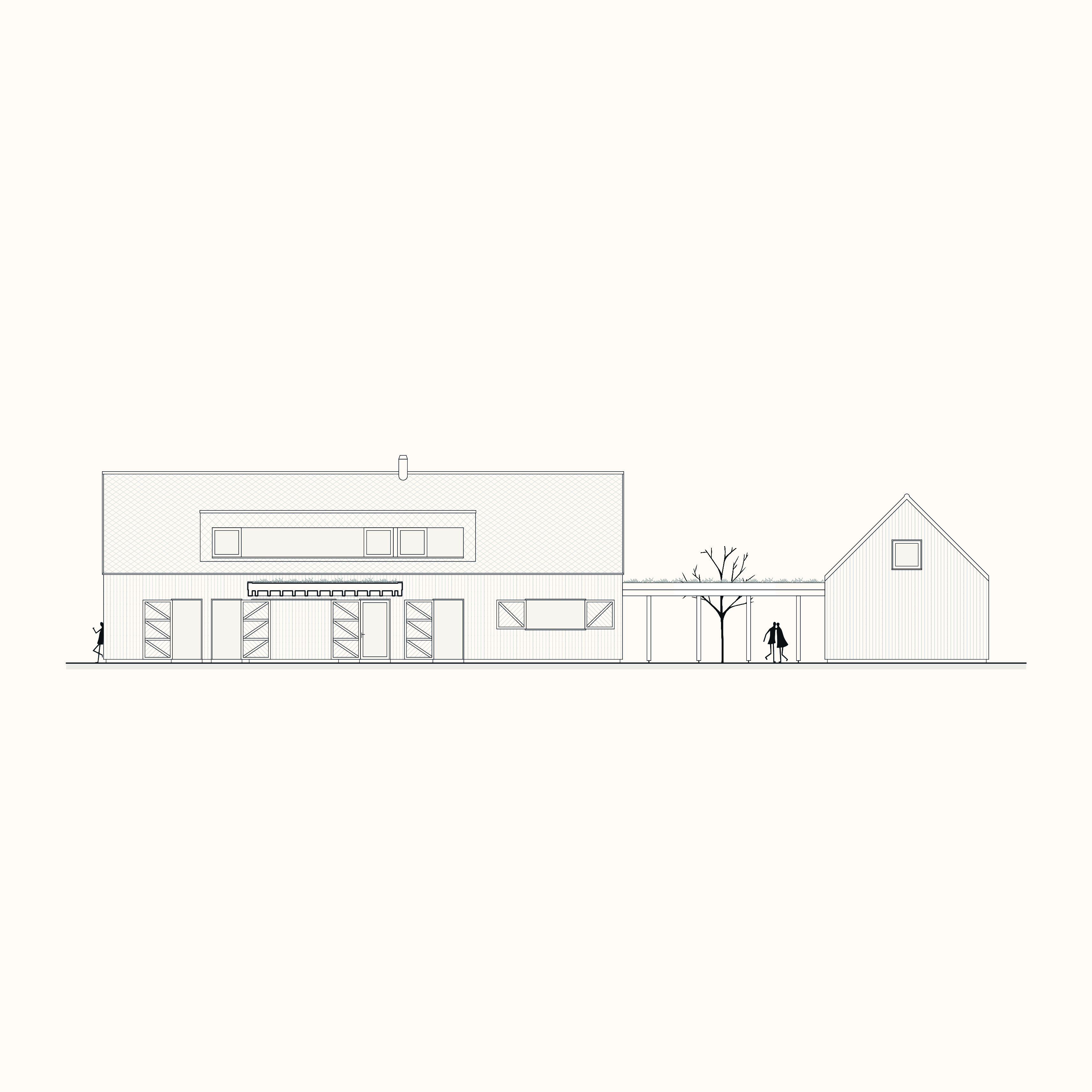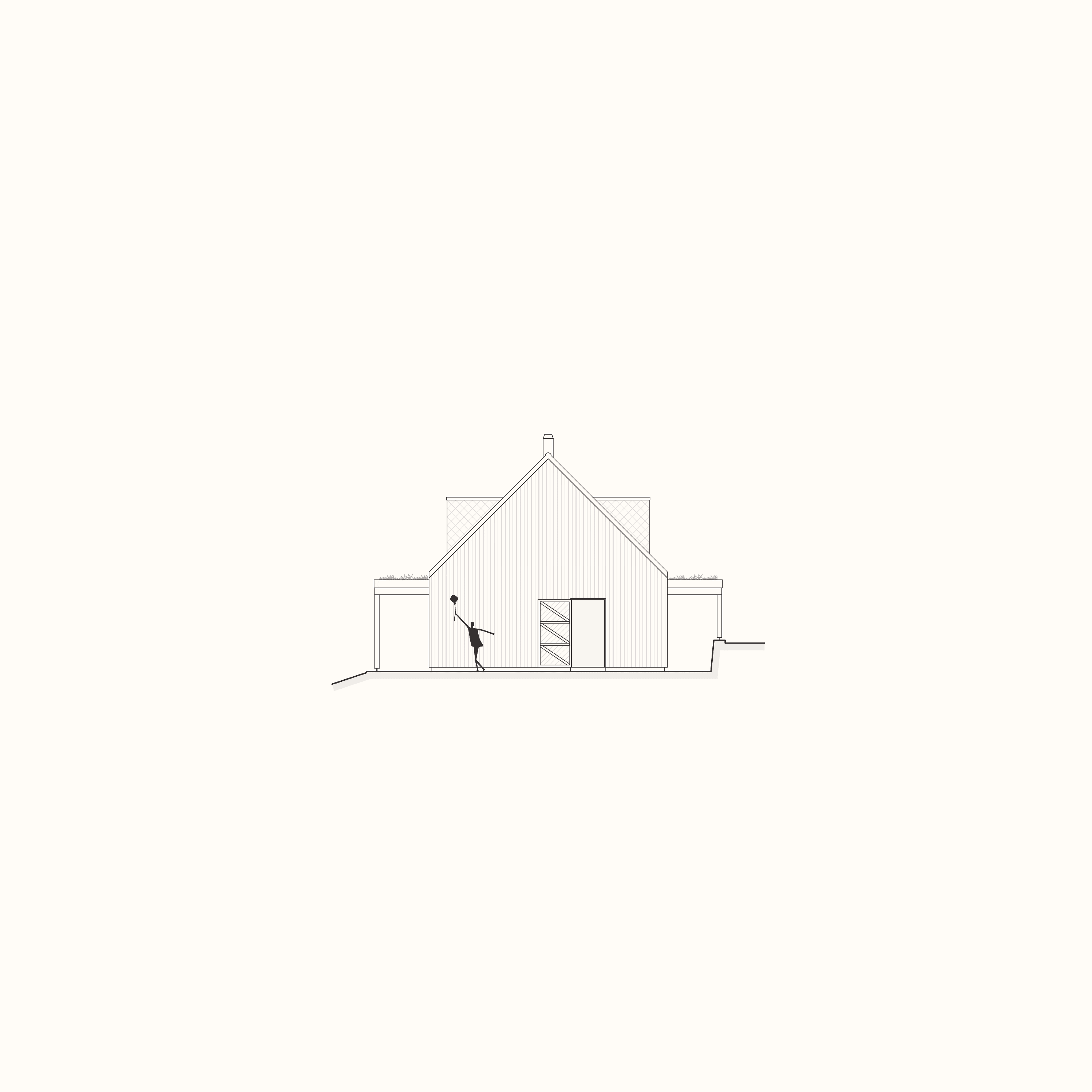 Dům jsme pojali jako dvojici podélných hmot s tradiční sedlovou střechou, které dohromady vytvářejí klidnou a harmonickou kompozici v krajině. Propojuje je horizontální konstrukce s vegetační střechou, která v přízemí tvoří zápraží a přirozené stínění. V místě mezi hmotami, kde je konstrukce otevřena vzniká kruh, jímž prochází strom. Ten se stává přirozeným centrem dění, kolem kterého se dá posedět, zavěsit hamaku nebo promítat letní kino.