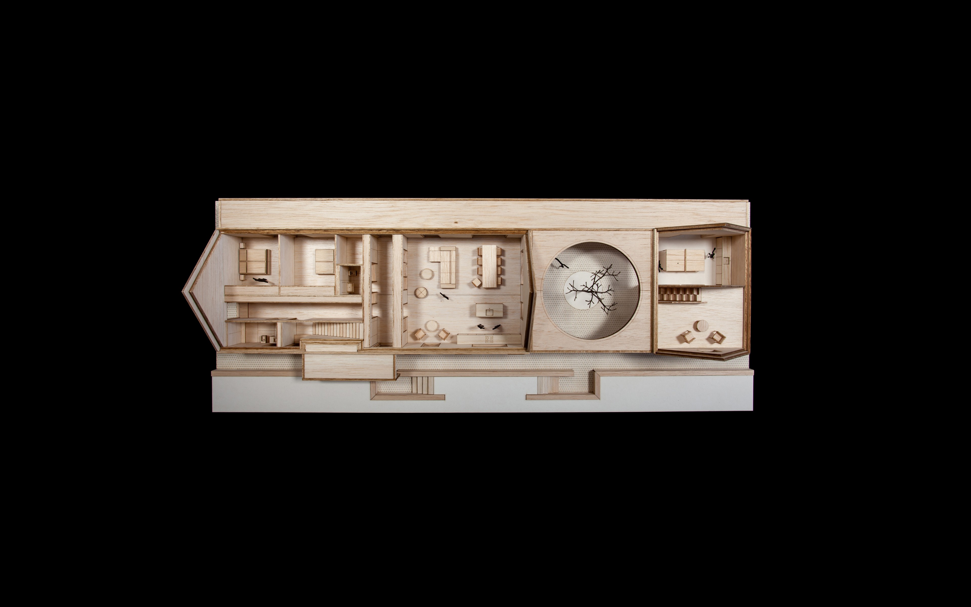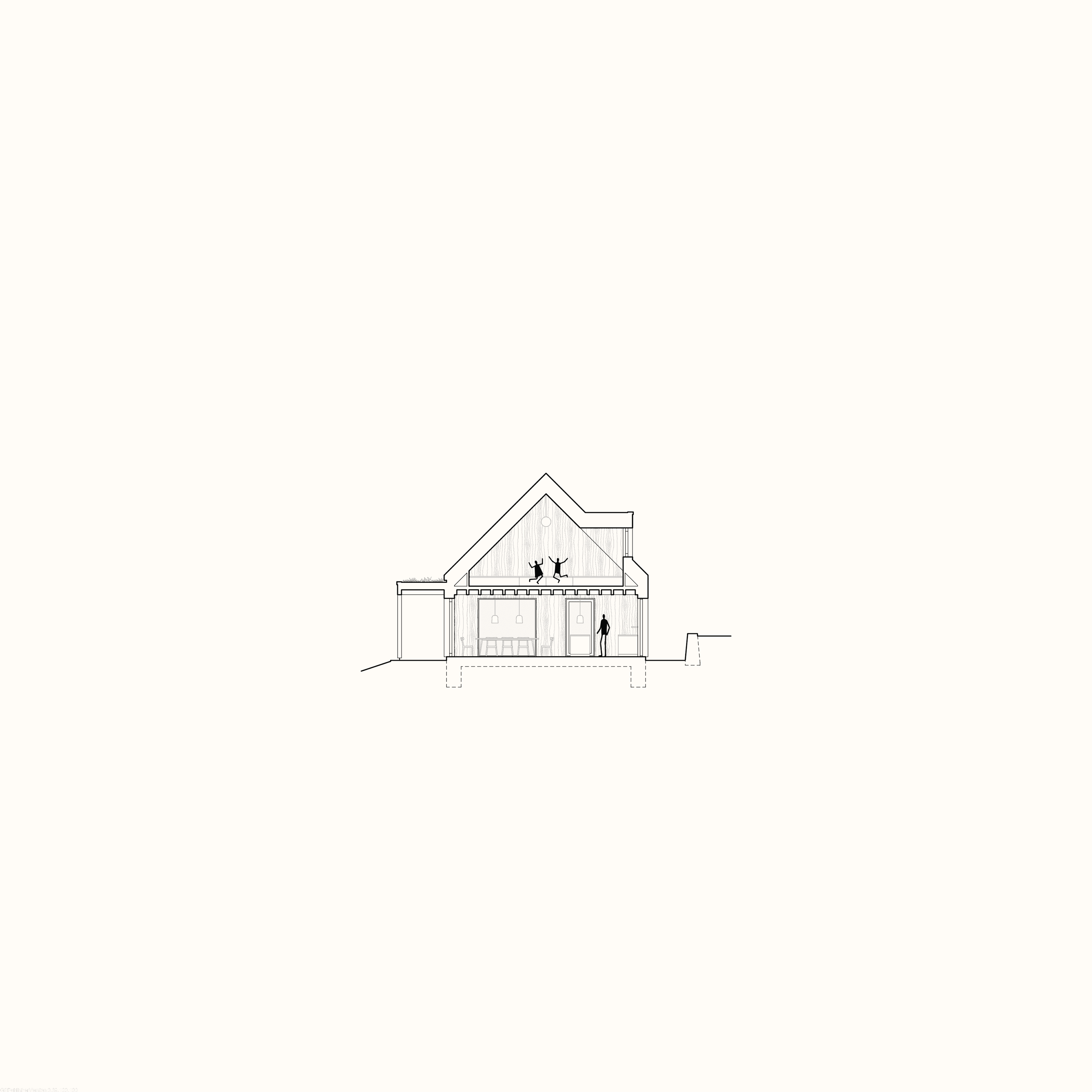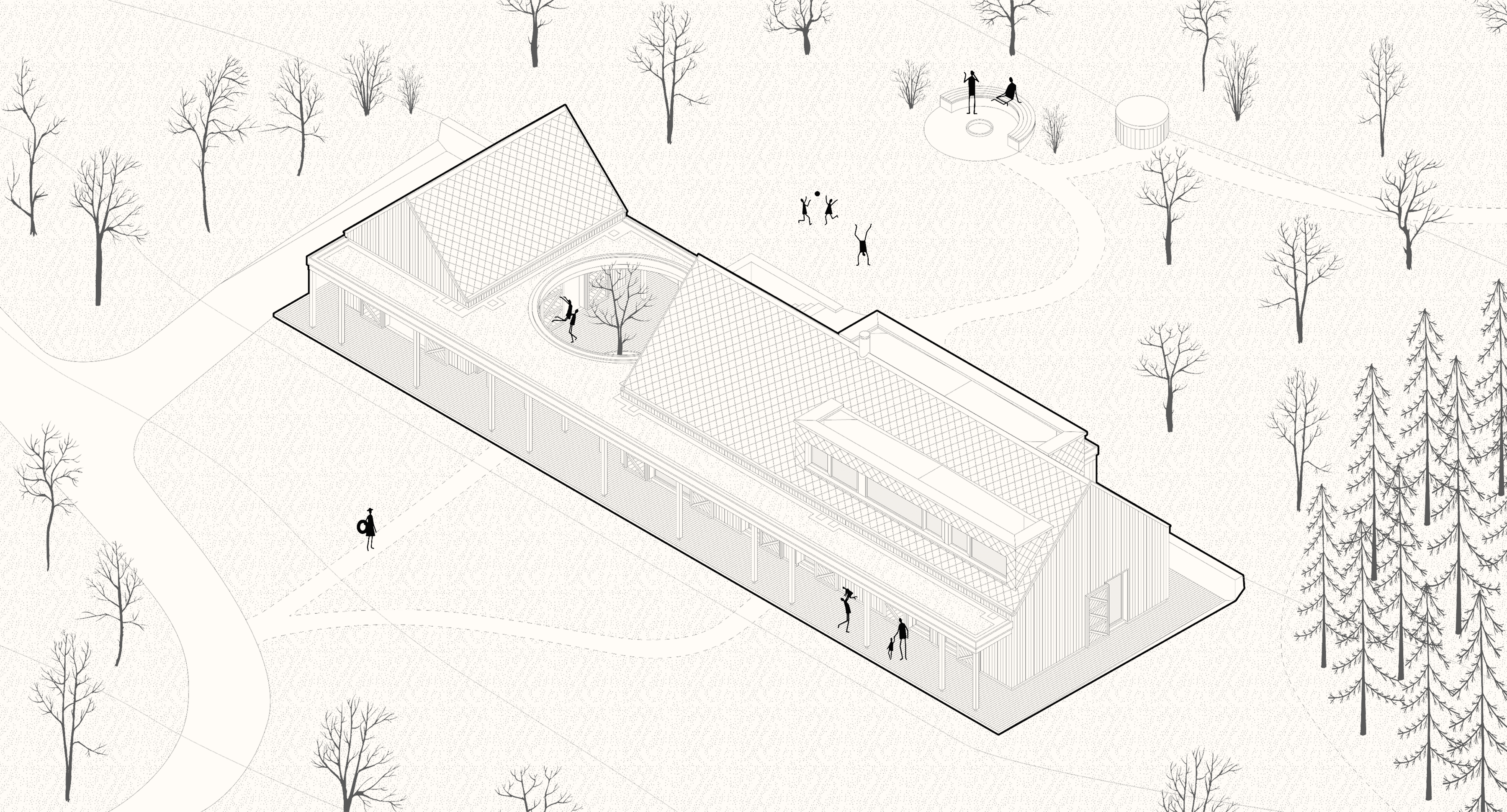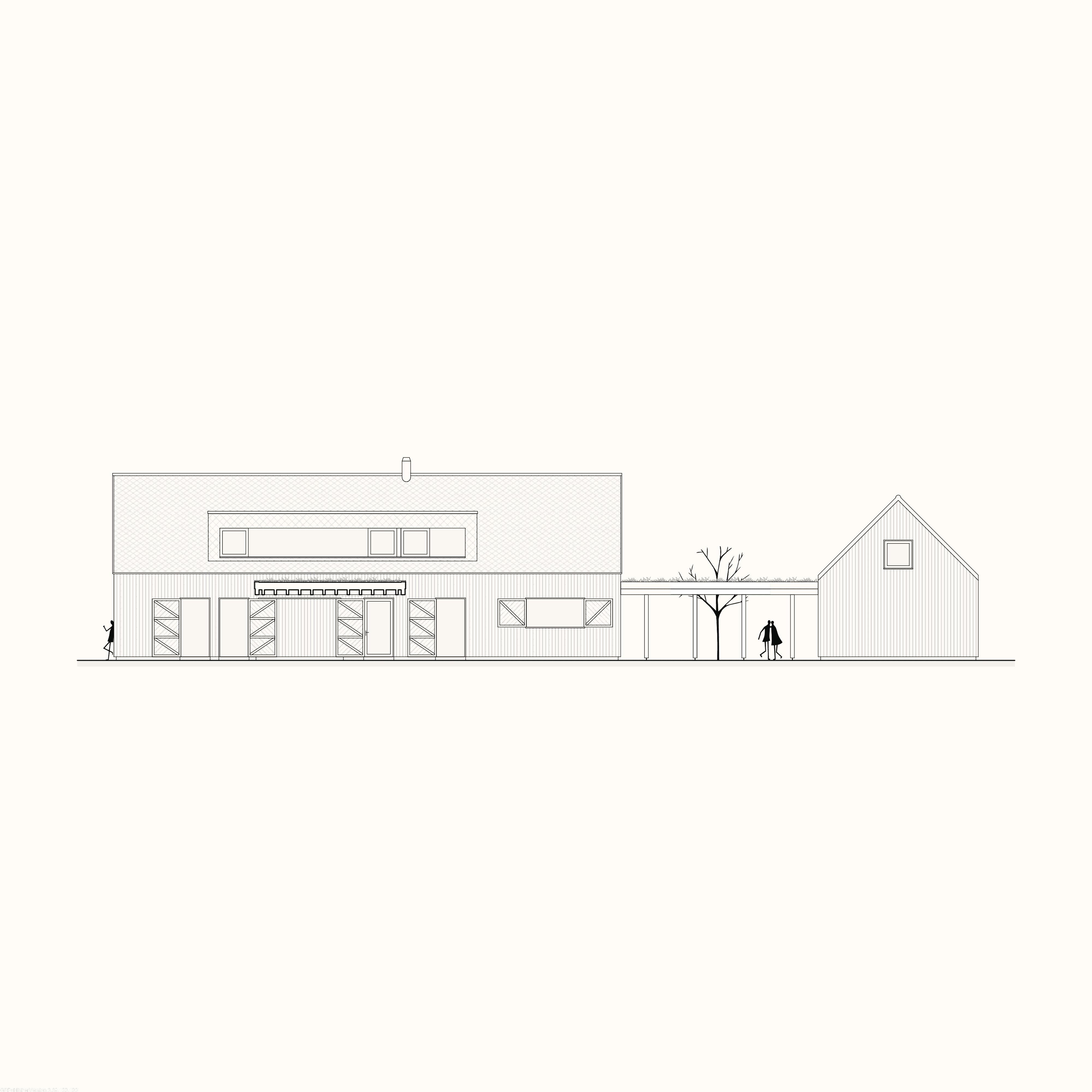 Dům jsme pojali jako dvojici podélných hmot s tradiční sedlovou střechou, které dohromady vytvářejí klidnou a harmonickou kompozici v krajině. Propojuje je horizontální konstrukce s vegetační střechou, která v přízemí tvoří zápraží a přirozené stínění. V místě mezi hmotami, kde je konstrukce otevřena vzniká kruh, jímž prochází strom. Ten se stává přirozeným centrem dění, kolem kterého se dá posedět, zavěsit hamaku nebo promítat letní kino.
