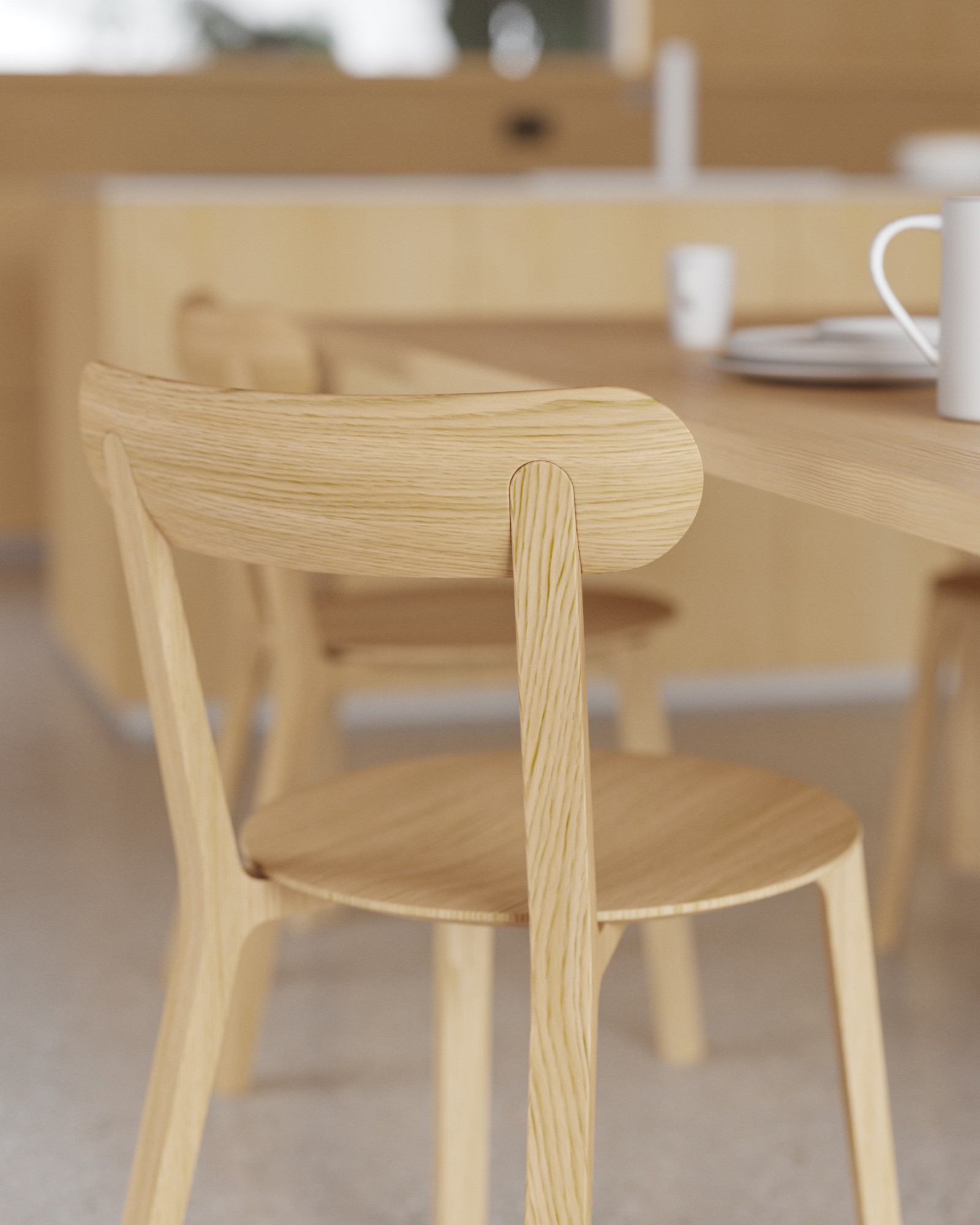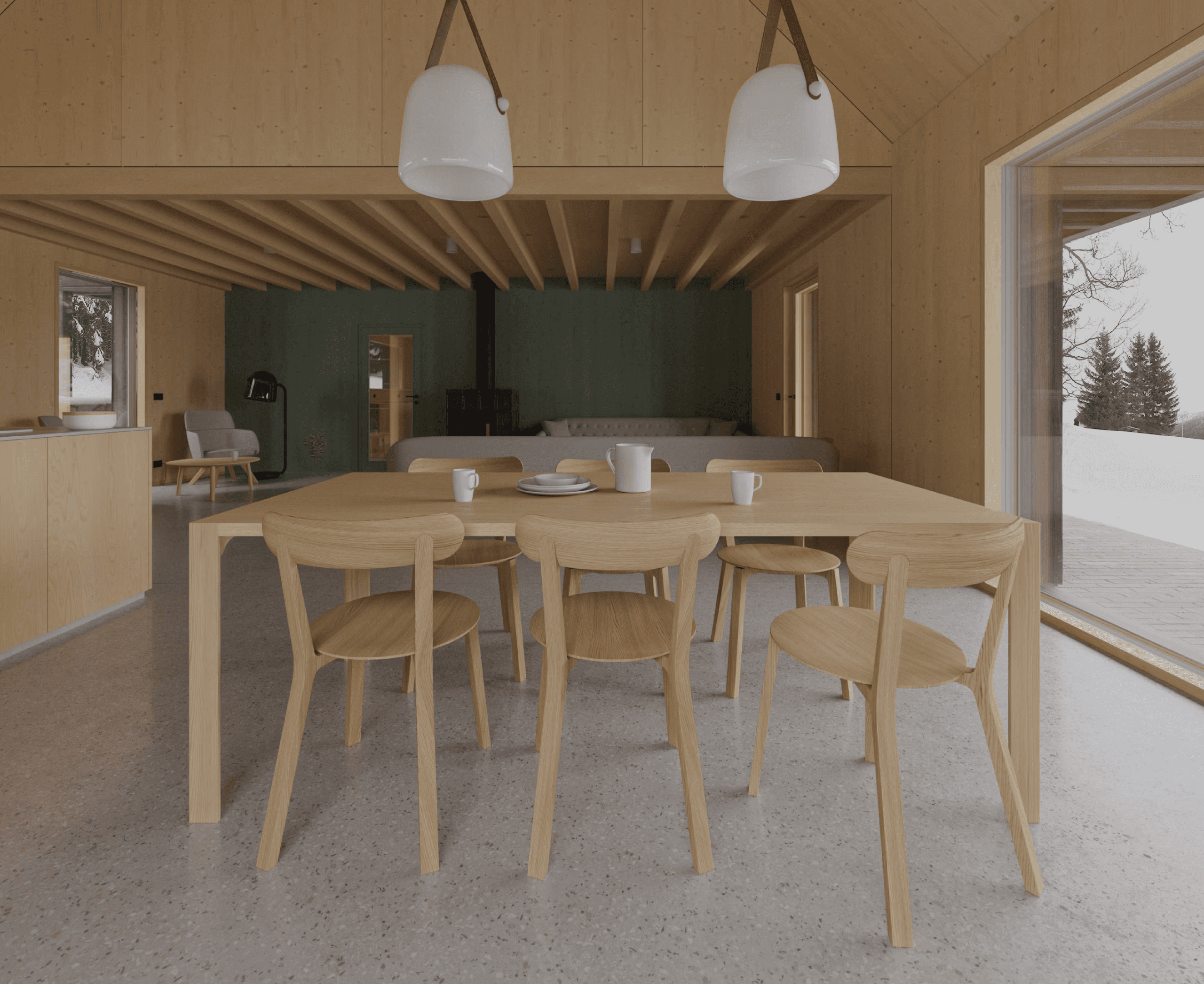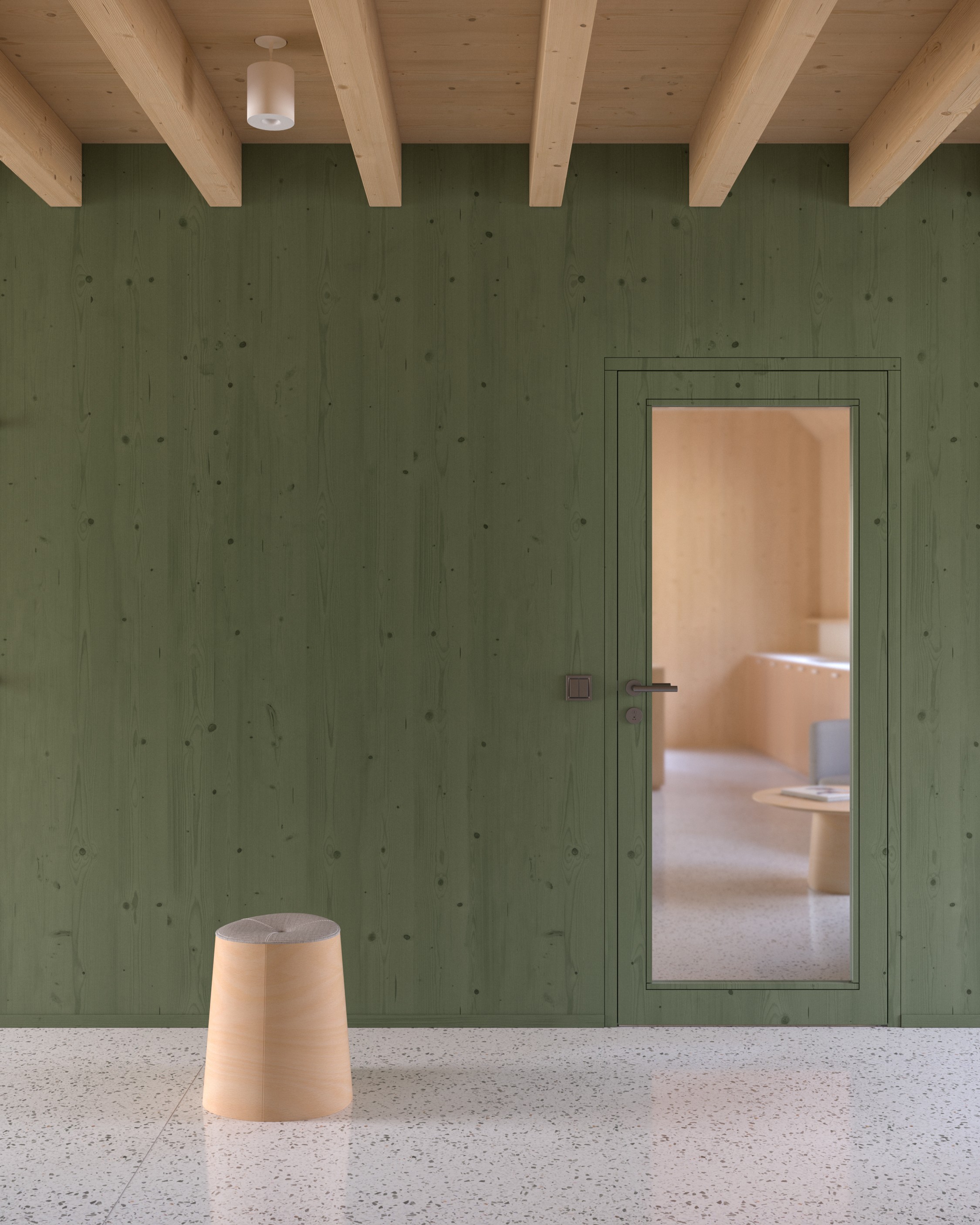 CLT panely a biodesky zůstaly v interiéru přiznané. Dřevo dýchá, přirozeně pracuje s vlhkostí a vytváří zdravé prostředí, které je cítit už po prvním nadechnutí.