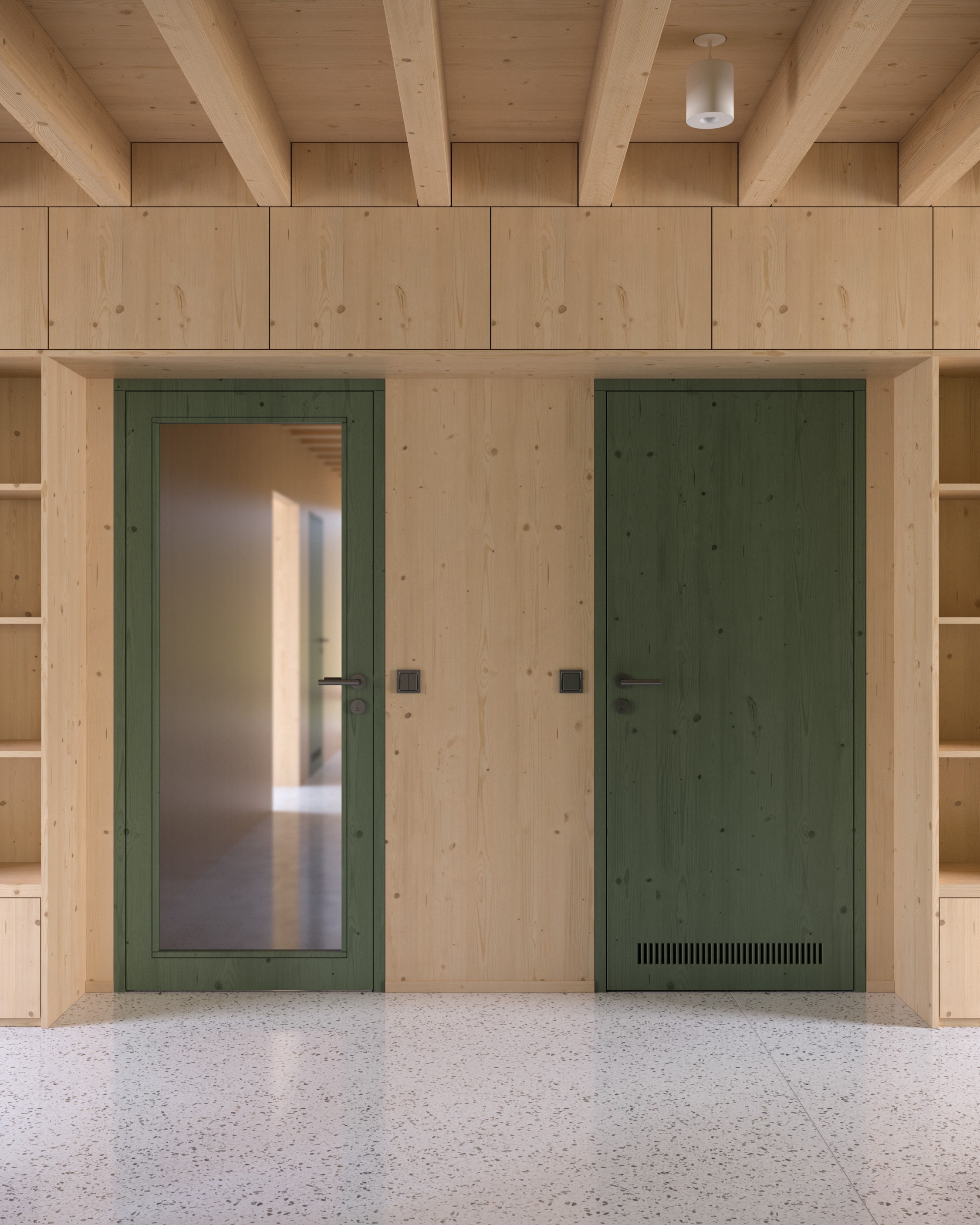 Ústředním prvkem domu je střední stěna natřená průhlednou zelenou barvou, která prostor sjednocuje a stává se jeho srdcem. Z této myšlenky pak vyrůstají i detaily: všechny dveře jsou tónovány do stejného odstínu, takže se motiv zelené jemně rozlévá celým domem. Tento prvek má i svou vzpomínku. Původní usedlost, která tu kdysi stála, měla uvnitř stejné zelené dveře. Chtěli jsme tuhle stopu uchovat. Je to malé gesto, které propojuje nové se starým a dává domu ducha, který zůstane v paměti každého, kdo tudy projde.